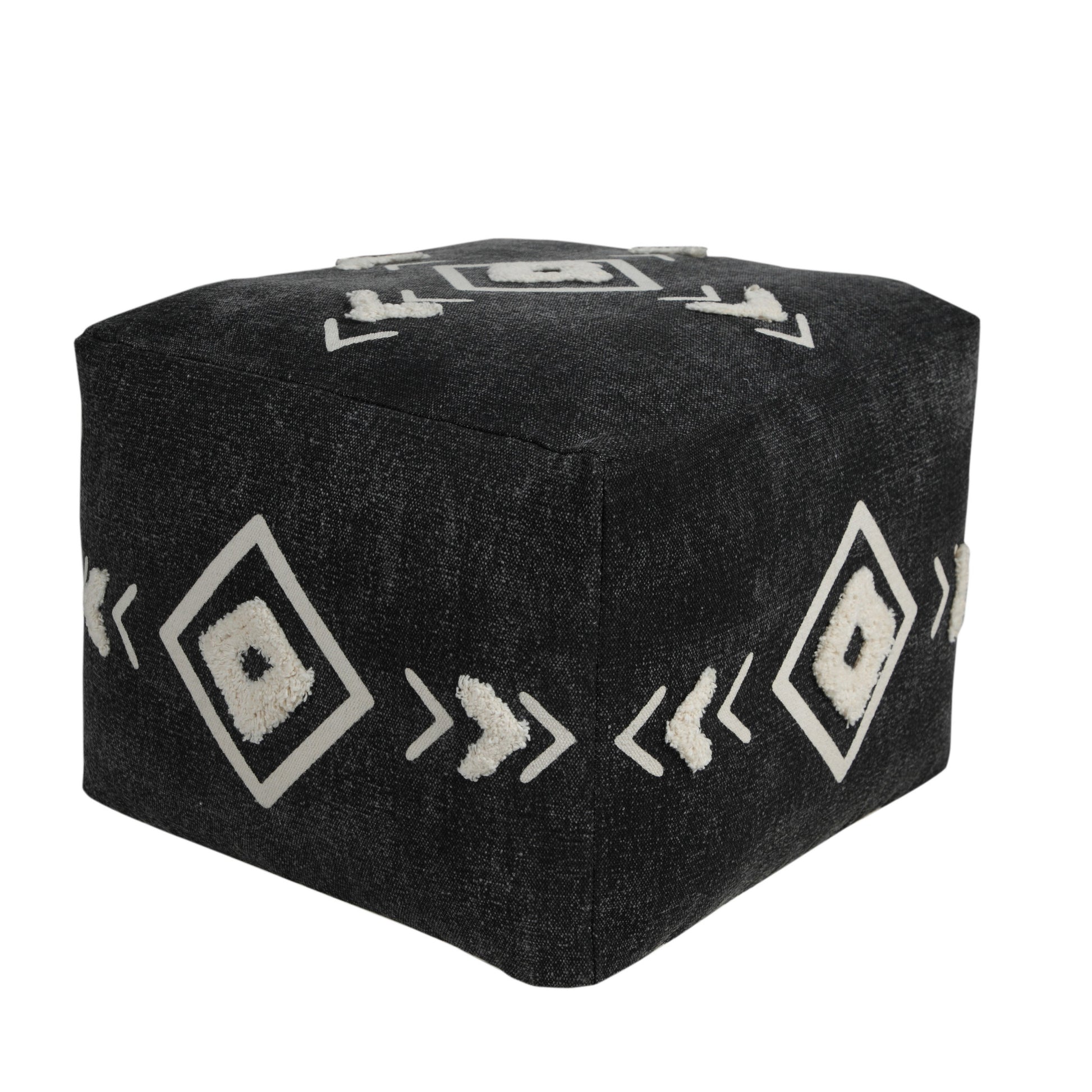 Get ready to relax with this 18-inch black cotton geometric pouf ottoman. Add chic style to your space with this fun pouf that not only looks cool but can be a great footrest or extra seat when needed. Expertly upholstered with padding and soft 100% cotton in a geometric pattern, this ottoman is as comfortable as it is good looking. Easy to blend into most any room, a ottoman is a way to add a good-looking accent to your space that can also be practical and useful. 14-inch h x 18-inch w x 18-inch d.