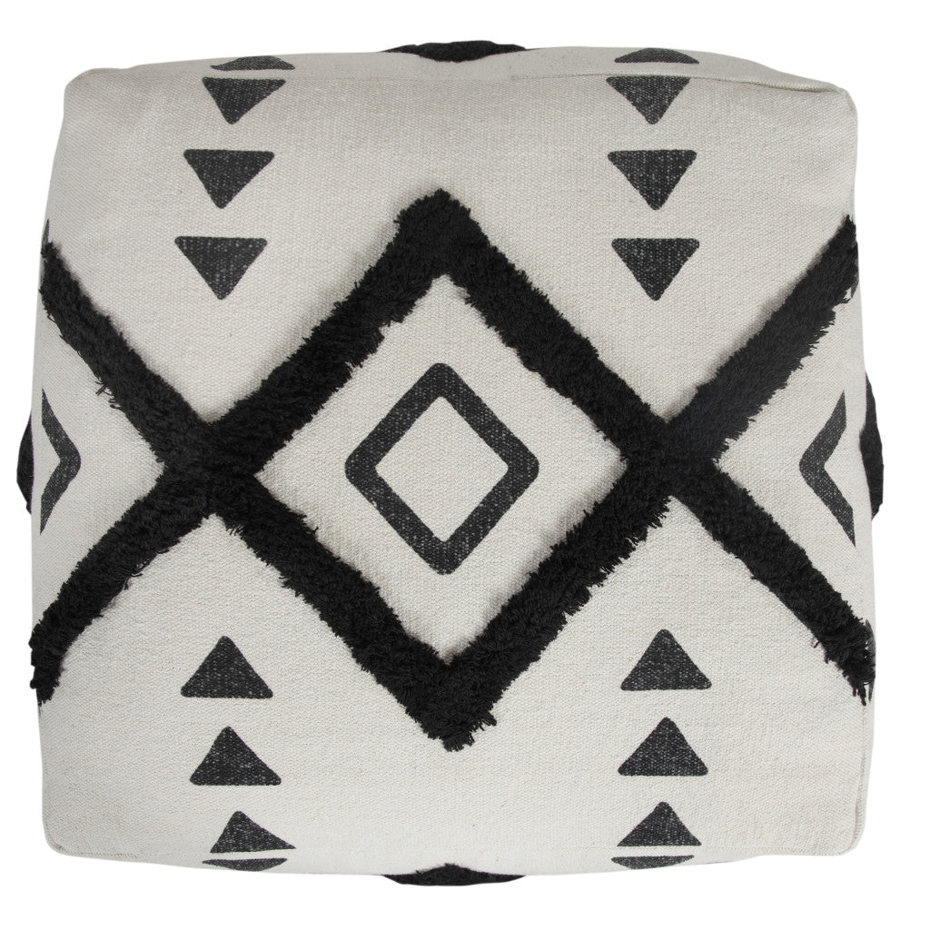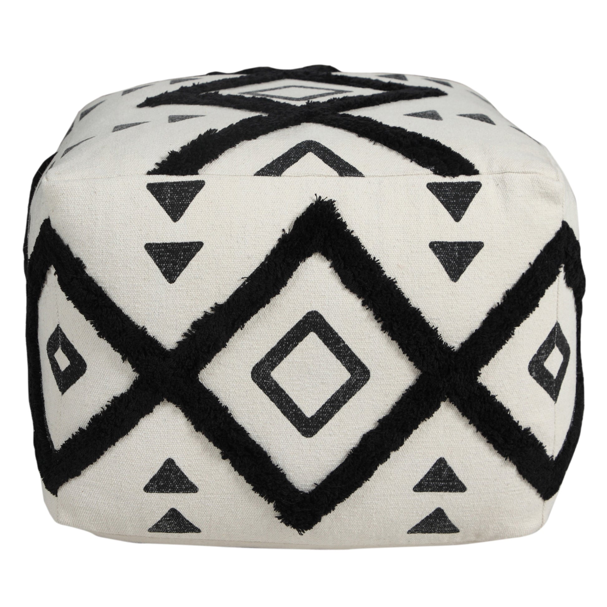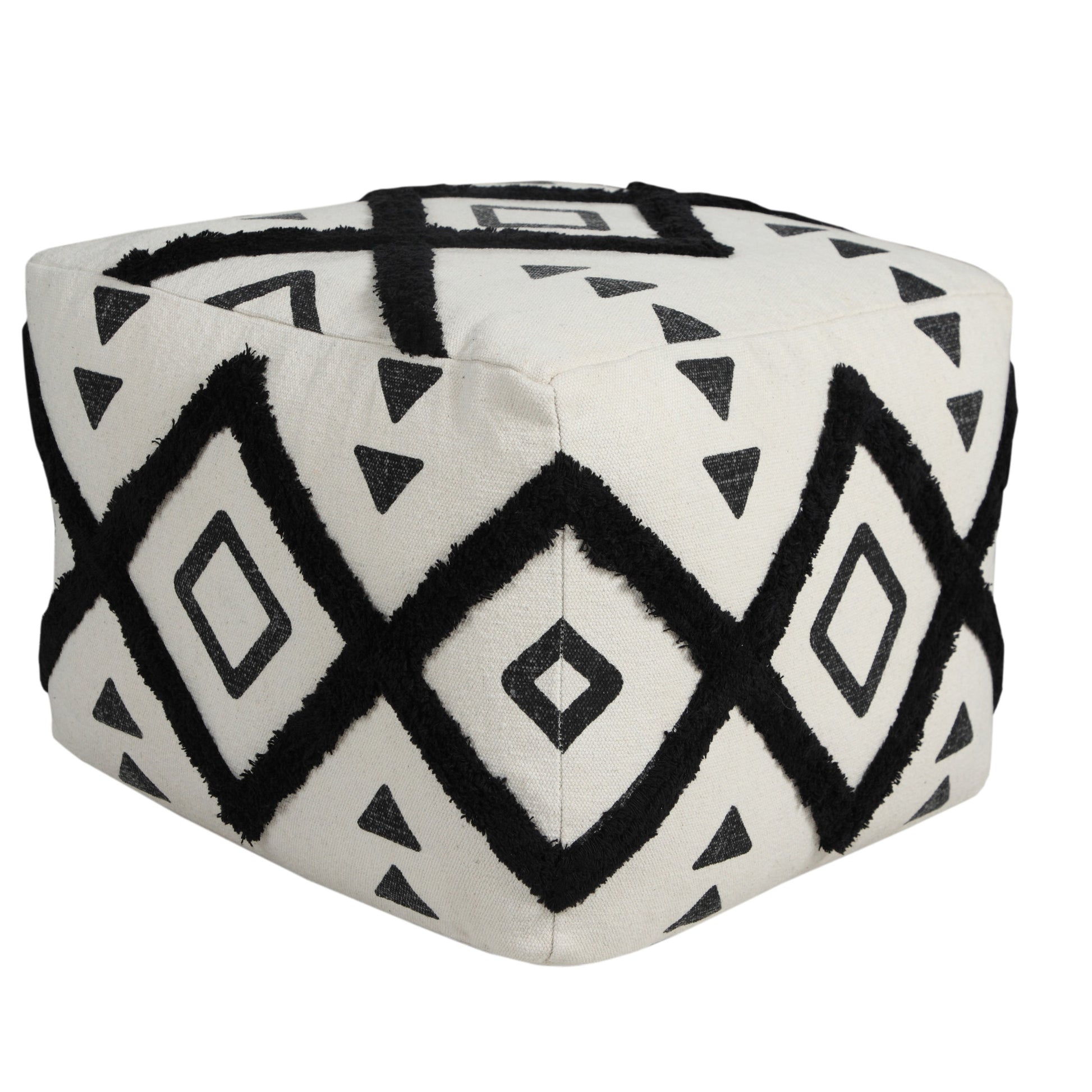 Practicality and fashion mix together with this handy 18-inch white cotton geometric pouf ottoman. Add chic style to your space with this fun pouf that not only looks cool but can be a great footrest or extra seat when needed. Expertly upholstered with padding and soft 100% cotton in a geometric pattern, this ottoman is as comfortable as it is good looking. Easy to blend into most any room, a ottoman is a way to add a good-looking accent to your space that can also be practical and useful. 14-inch h x 18-inch w x 18-inch d.
