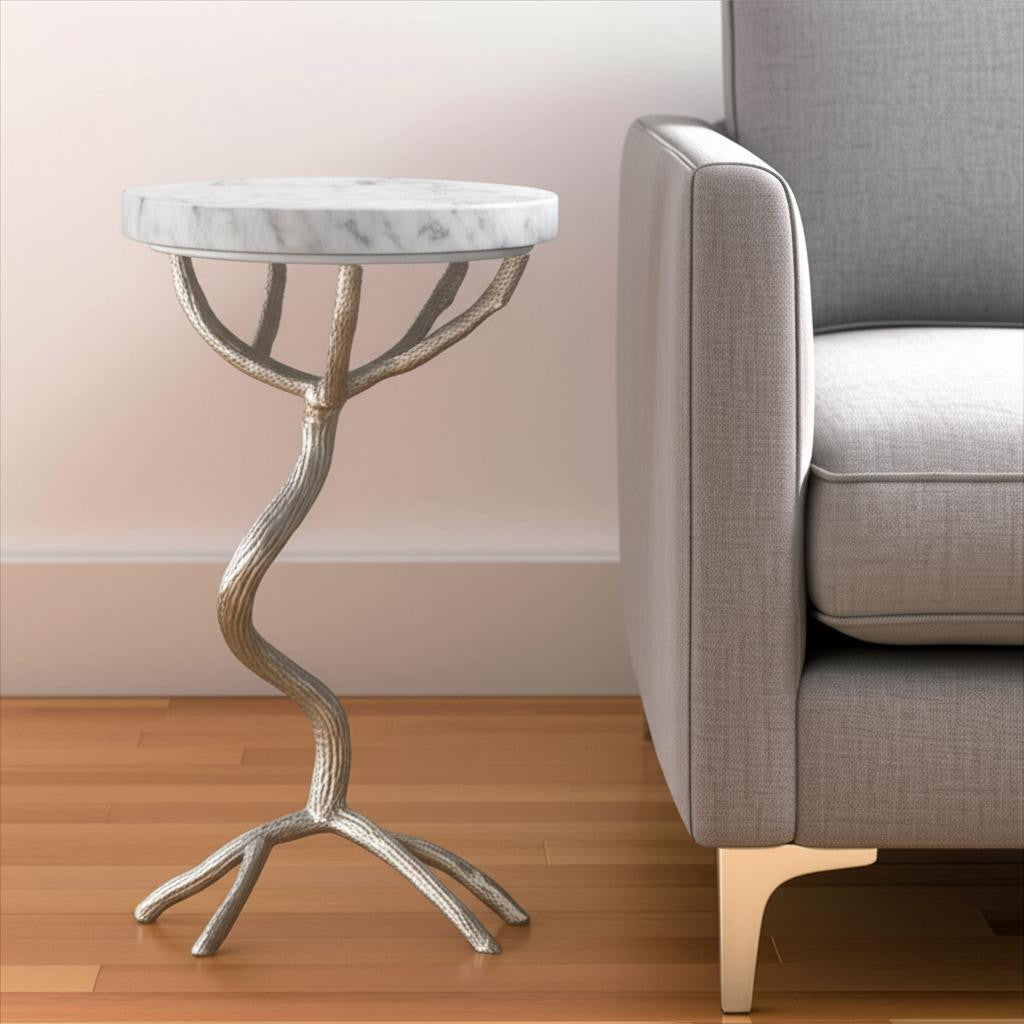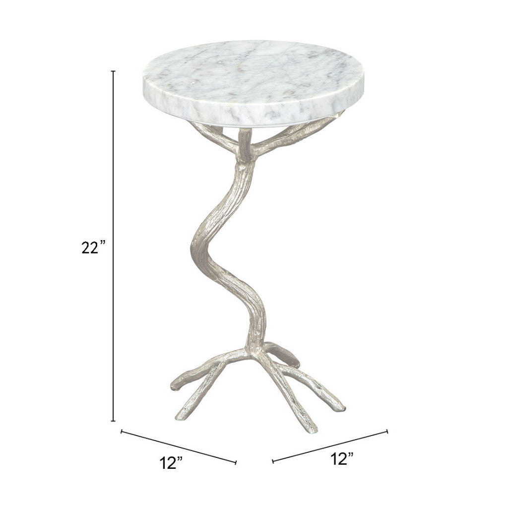 Distinctive in style the 22-inch silver aluminum twigs and white marble round end table radiates a versatile charm. Quality construction from the cast aluminum base combines with white and gray veiny marble of the top to give this table a fresh and updated look. A great accent on either side of the sofa or bed, this adorable end or side table is just what you need. 22-inch H x 12-inch W x 12-inch D