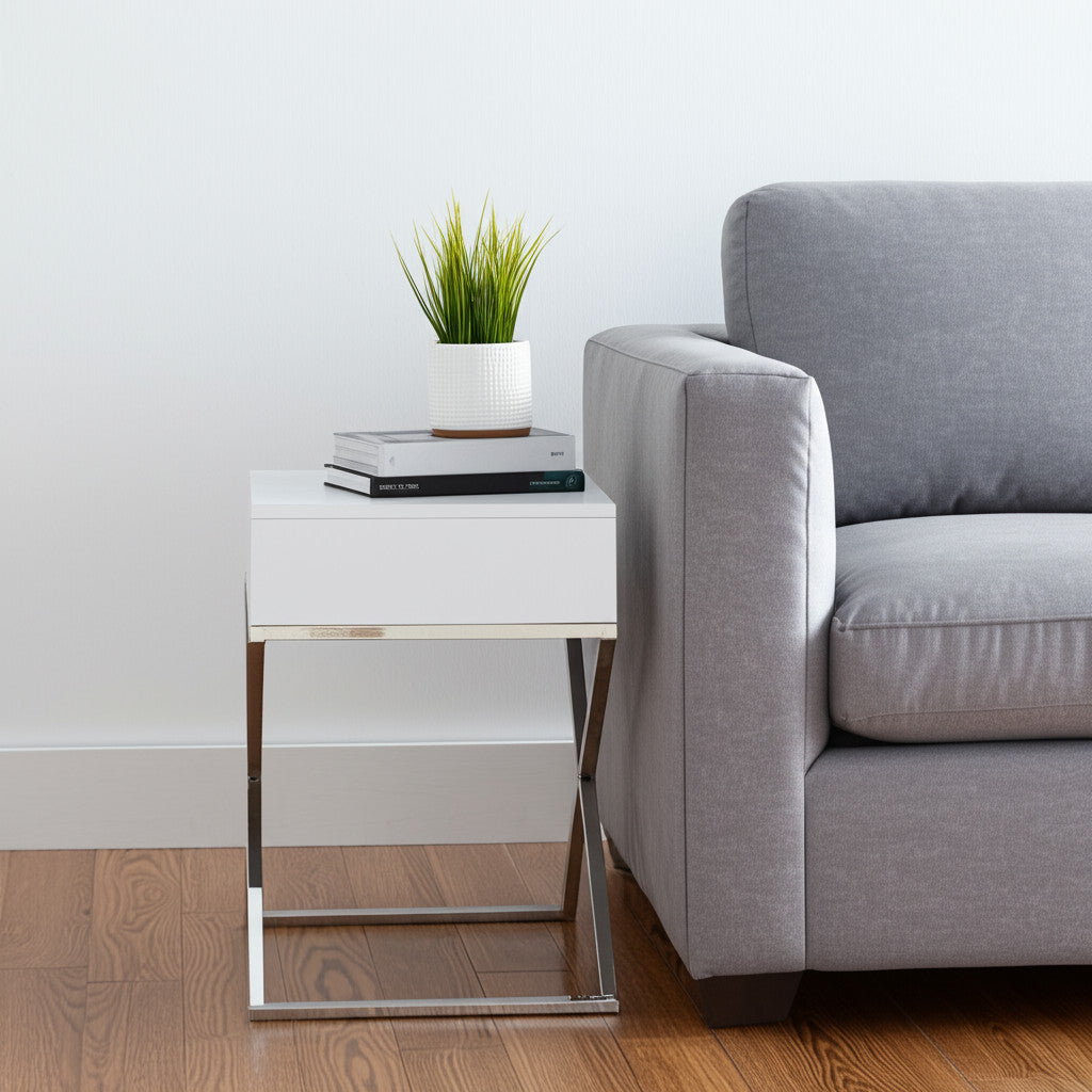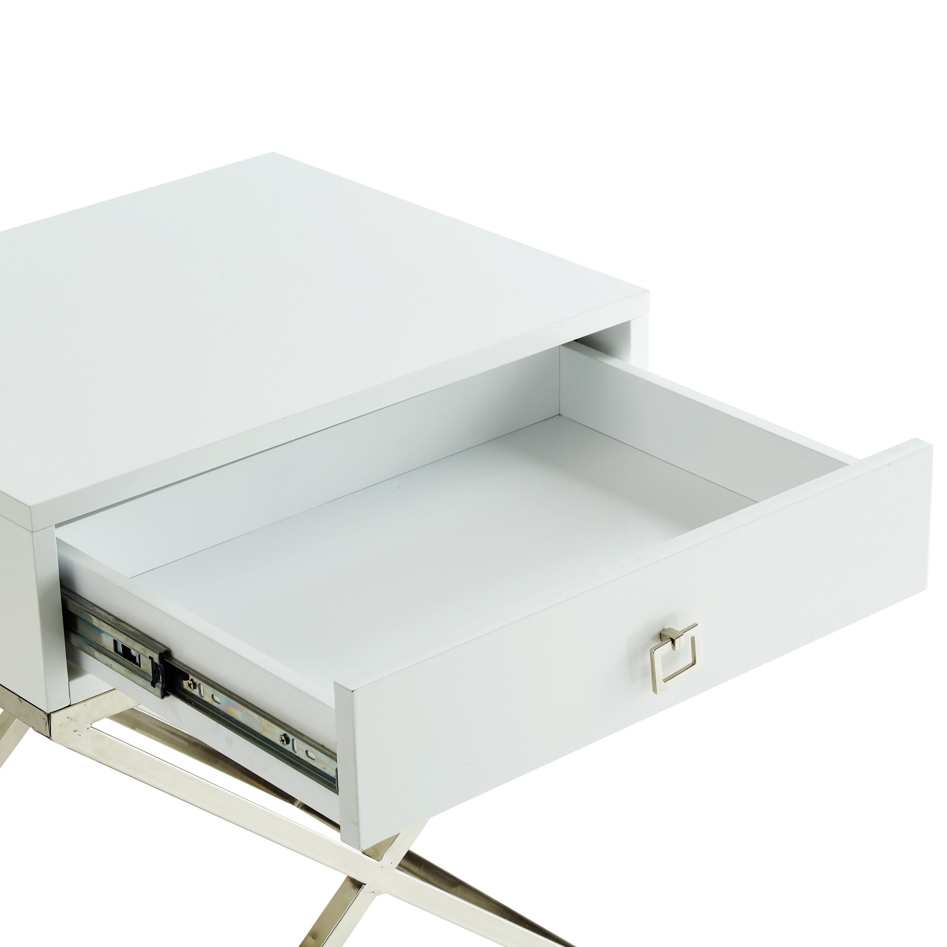 Show off your exquisite taste with this 25-inch silver and white end table with drawer. Quality construction from the silver metal base combines with white manufactured wood of the top to give this table a fresh and updated look. Includes a single easy pull out drawer for handy storage of life's little essentials. A great accent on either side of the sofa or bed, this adorable end or side table is just what you need. You can match it with other pieces to get the ideal look for your place. 25-inch H x 22-inch W x 18-inch D