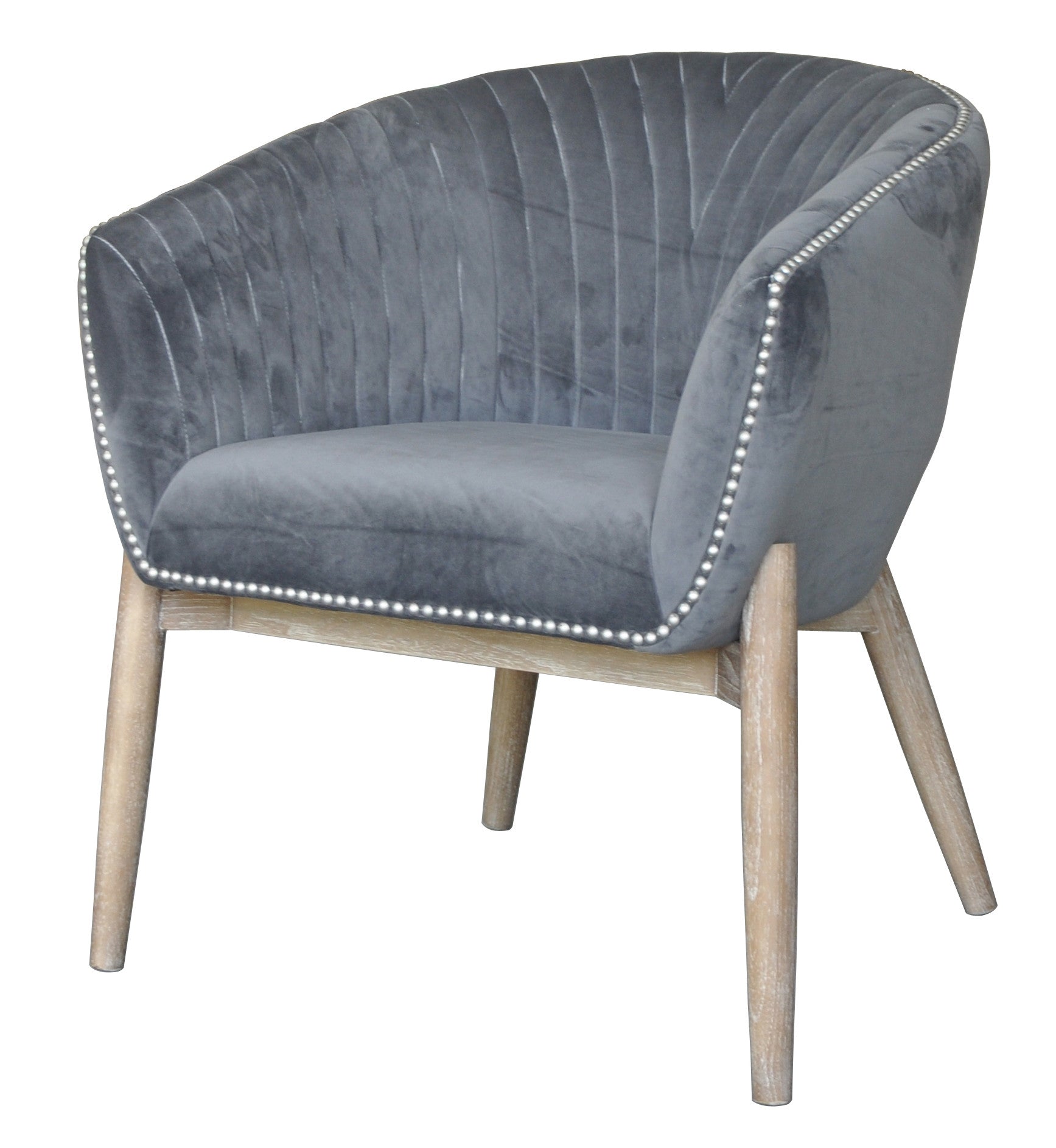 Add an air of fashion to your room and rejuvenate the space with this 28-inch gray and brown velvet armchair. Built to last this armchair is finished in channel tufted gray velvet to give your room a great update. The high-quality solid wood inner frame flaunts convenient armrests and a cushion back that are complimented by soft and comfortable cushioning. Silver nail head trim gives this chair a refined look that adds additional texture and visual interest. 32-inch h x 28-inch w x 27-inch d.