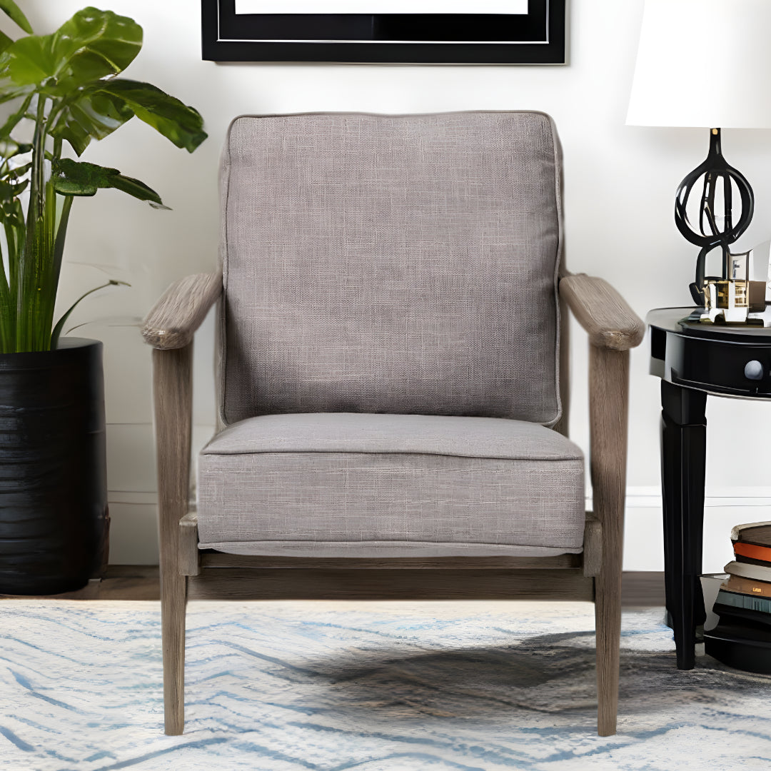 A mix of form and function, this 31-inch gray and brown fabric lounge chair will bring a good looking and usable accent to your space. Built to last this lounge chair is finished in solid gray fabric to give your room a great update. The sturdy inner frame is built with high quality solid wood, includes armrests, and features a cushion back that is accented with soft and comfortable cushioning. 32-inch h x 31-inch w x 28-inch d.