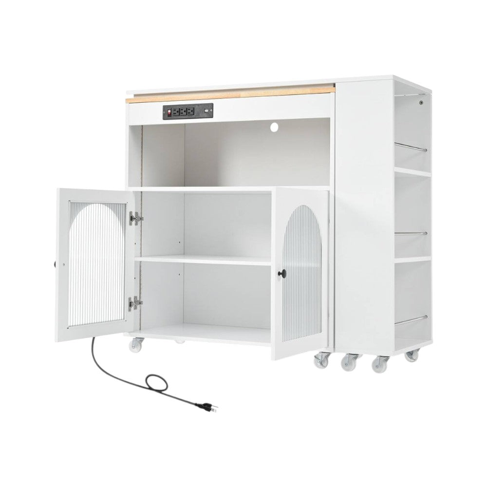 This 33-inch white wood rolling kitchen island with storage marks the beginning of a new era for kitchen decor. Made of a combination of durable solid and manufactured wood this rectangular island is a premium organizing solution that provides extra storage and counter space in your kitchen. The beautiful grains and natural variations of the solid wood give this piece its own unique appearance. Drawer storage also helps to keep those handy utensils and serving essentials neat, tidy, and ready to be used. Maximize your space with this multi- functional and good-looking kitchen island. 37.12-inch h x 33.22-inch w x 16.92-inch d.