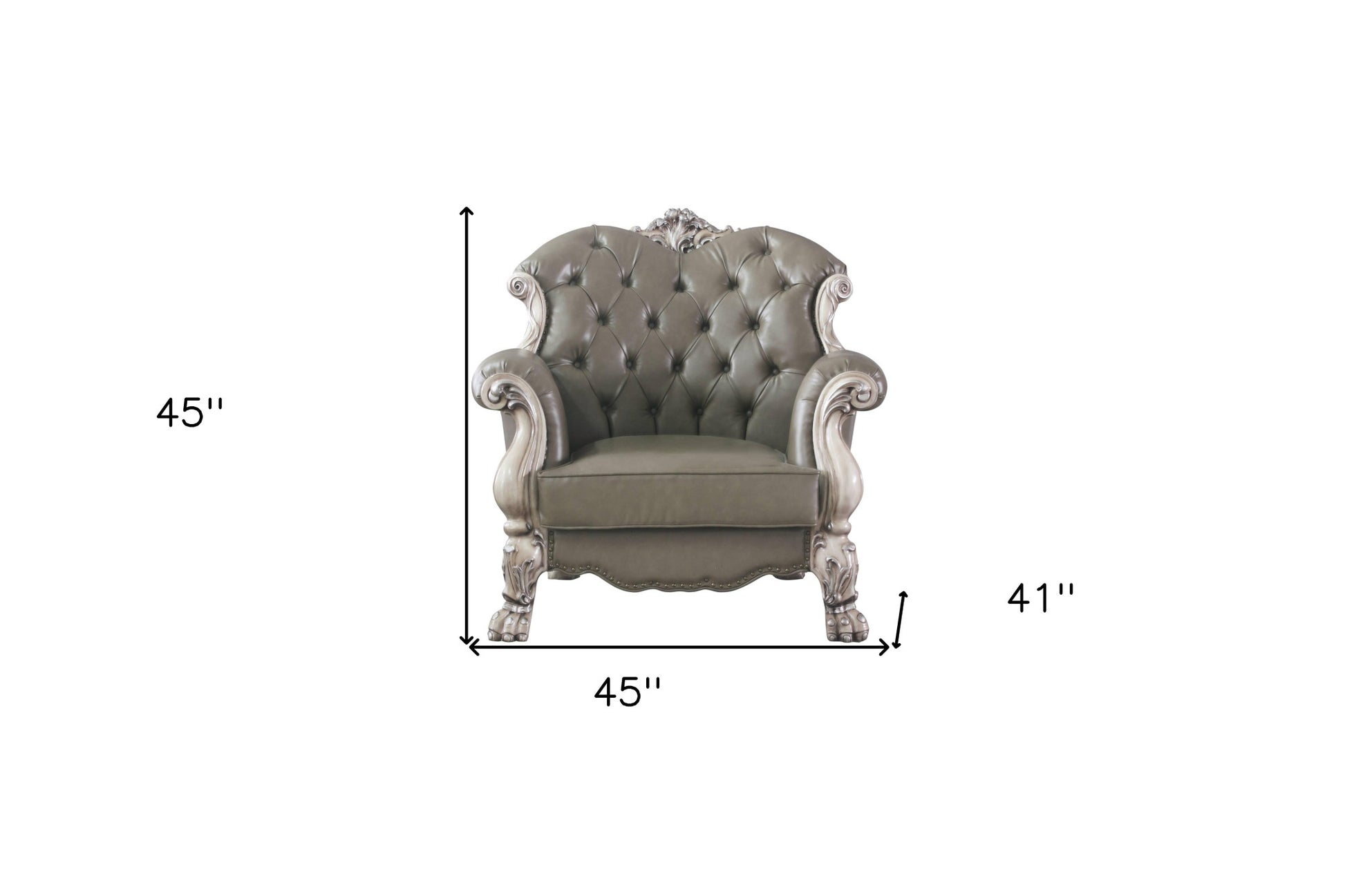 Stylish, elegant and fully functional, the 45-inch champagne faux leather arm chair adds a touch of panache to any set up. This gorgeous solid color champagne arm chair is masterfully upholstered in durable polyurethane. The sturdy inner frame is built with high quality manufactured wood, includes armrests, and features a fixed back that is accented with soft and comfortable cushioning. 45-inch h x 45-inch w x 41-inch d.