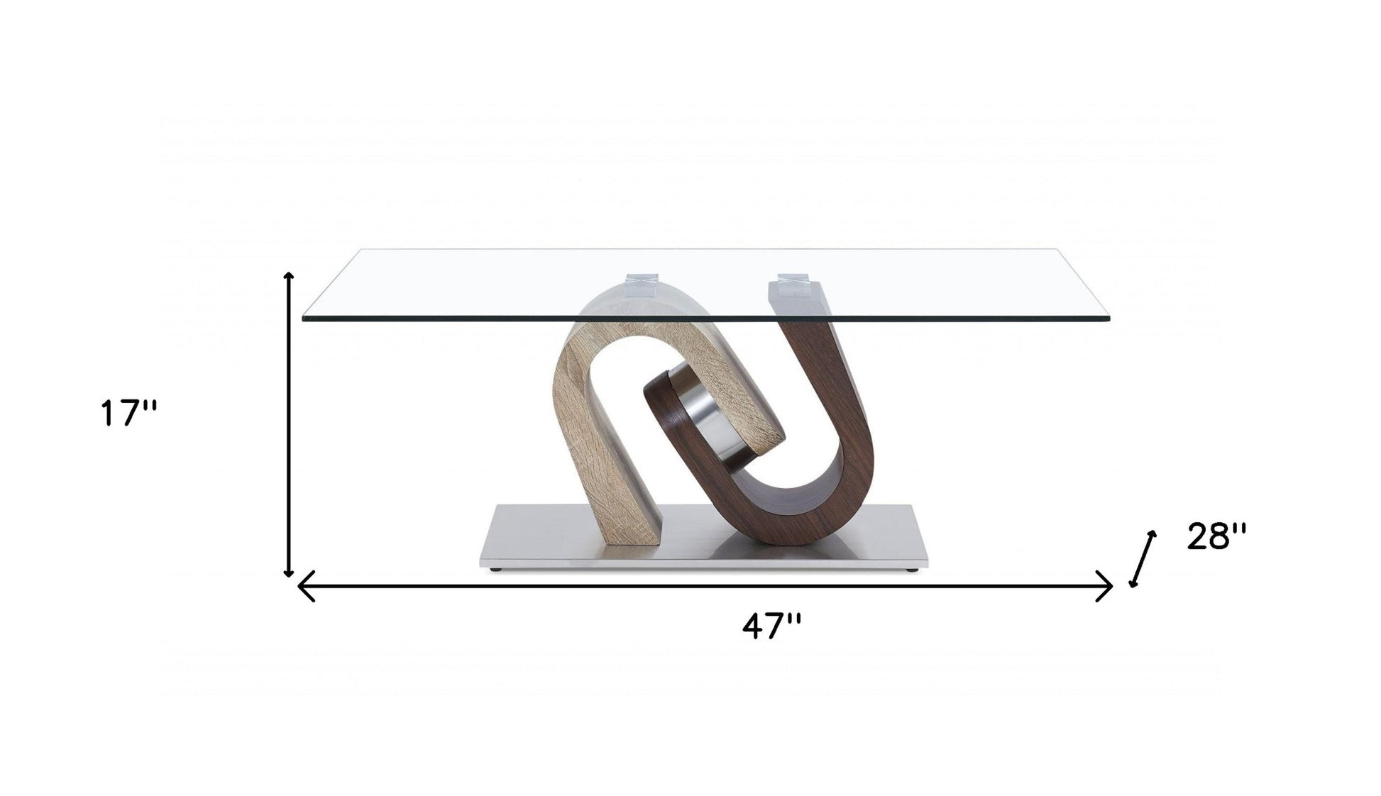 This good looking 47-inch clear and oak glass coffee table is sure to inspire compliments no matter where it sits. This rectangular table is an classic yet updated way to accent your room. It has a fresh design that will definitely breathe some fresh air into your interior. This coffee table is the sturdy, reliable and stylish answer to your living room needs. 17-inch H x 47-inch W x 28-inch D