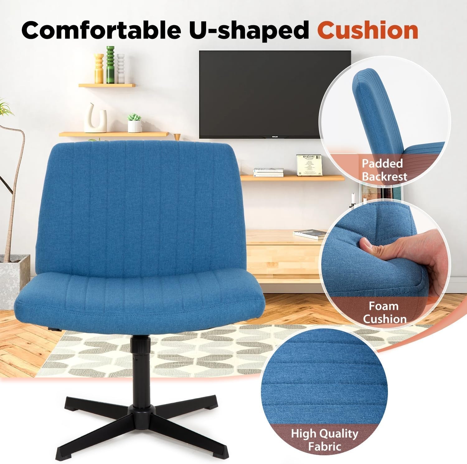 Experience ergonomic comfort and space-saving style with the Criss Cross Armless Chair — a wide, blue fabric desk chair that supports your back and keeps you productive during long work sessions.