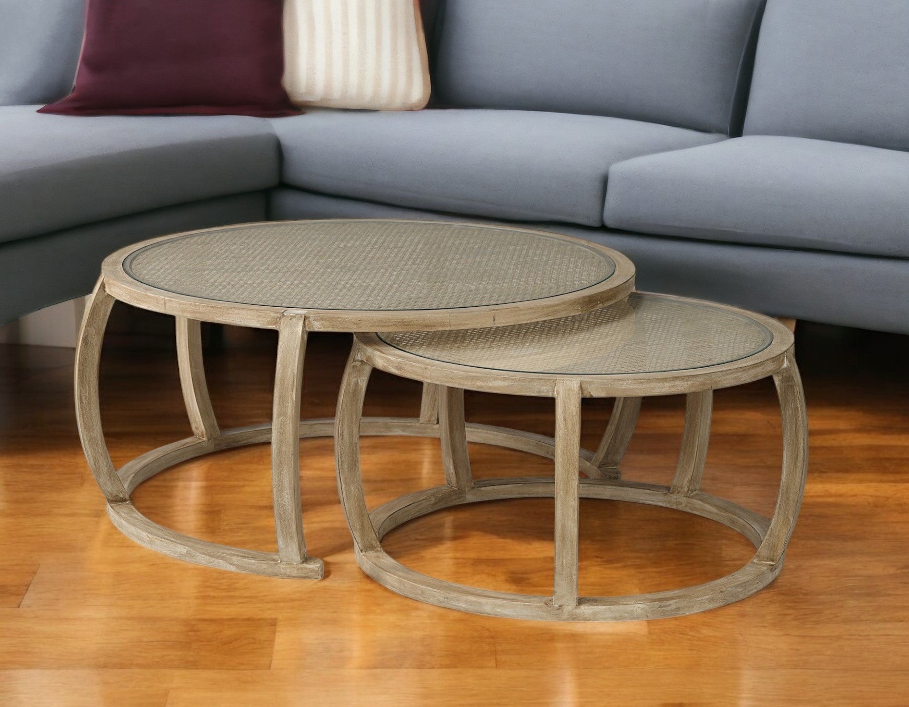 Brown Glass and Solid Wood Round Nested Coffee Tables
