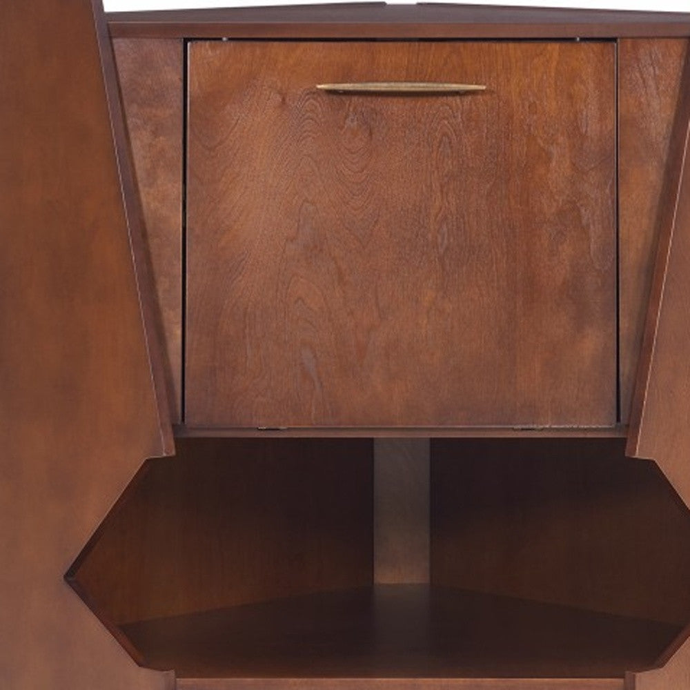 Add a little fun and fashion flair to your space with this Cosmo Brown and Black Corner Bar Cabinet. This compact cabinet features an easy-open front door that pulls down to reveal bar accessory and bottle storage while doubling as a counter or serving shelf. A mirrored back wall provides added elegance, while the open cubie space and three pull out drawers add room for display, storage and organization. Funky geometric side panels frame the sides adding an air of contemporary chic. 49" x 35" x 25"