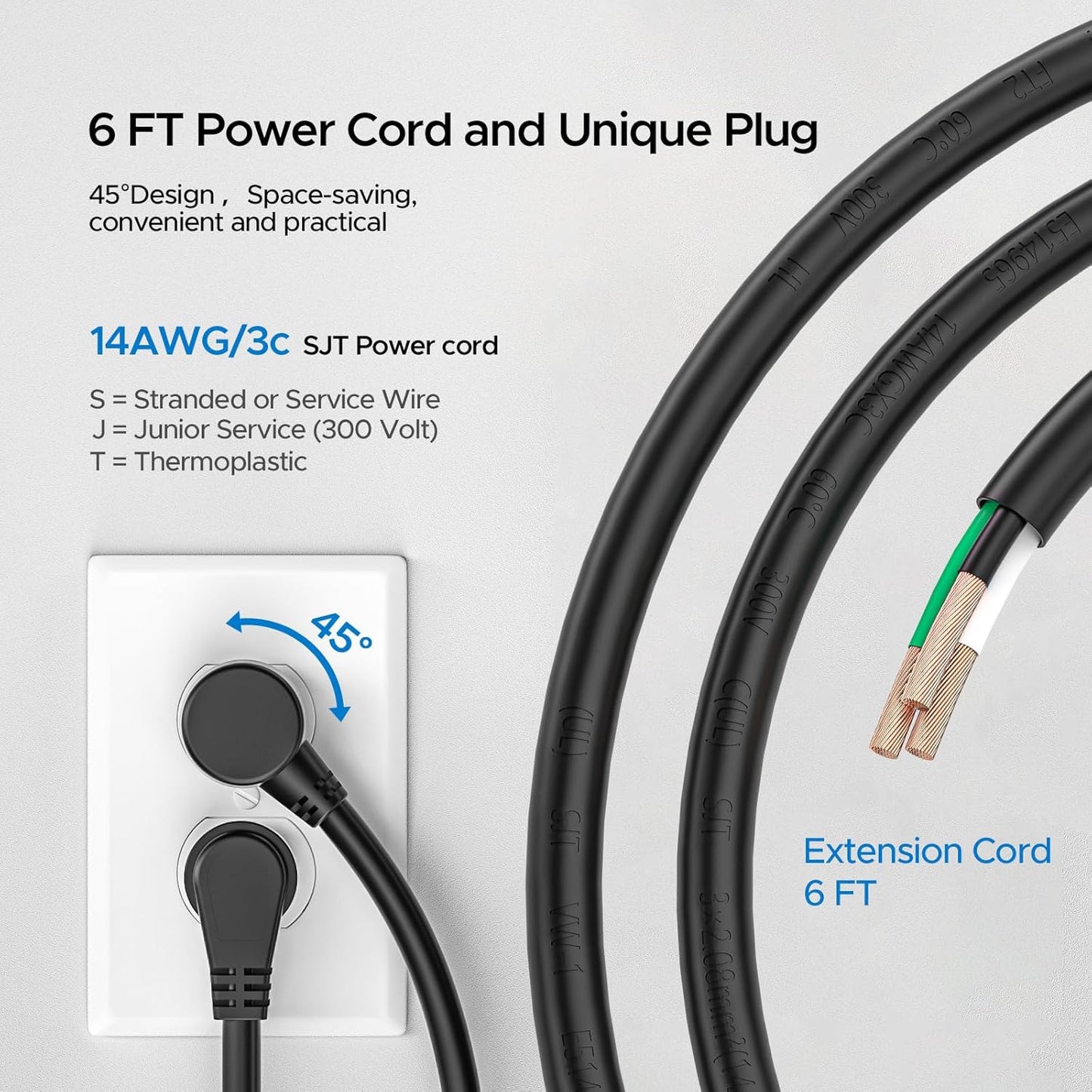 1.7-inch center-to-center outlets fit bulky plugs. The 45° angled flat plug and hanging slots enhance convenience. This thoughtful design makes it easy to handle DIY projects or power tools effortlessly, ensuring both functionality and ease of use.