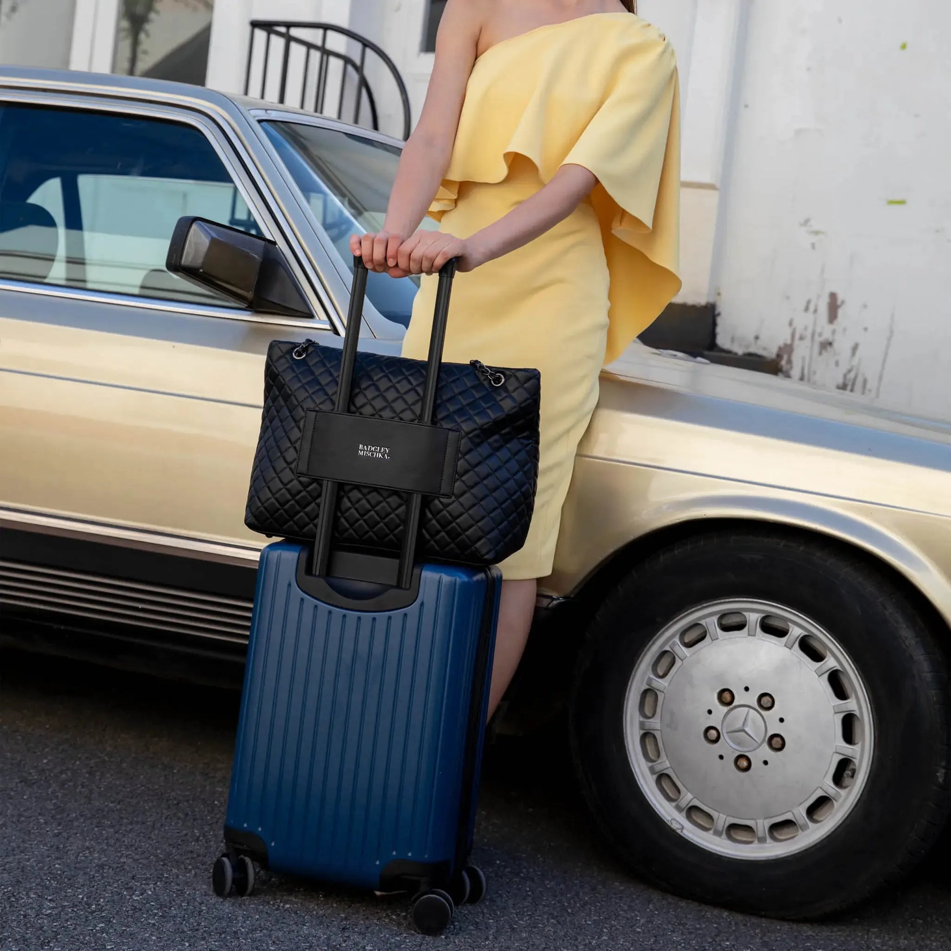 Polished gunmetal hardware and logo plate add a touch of modern glamour