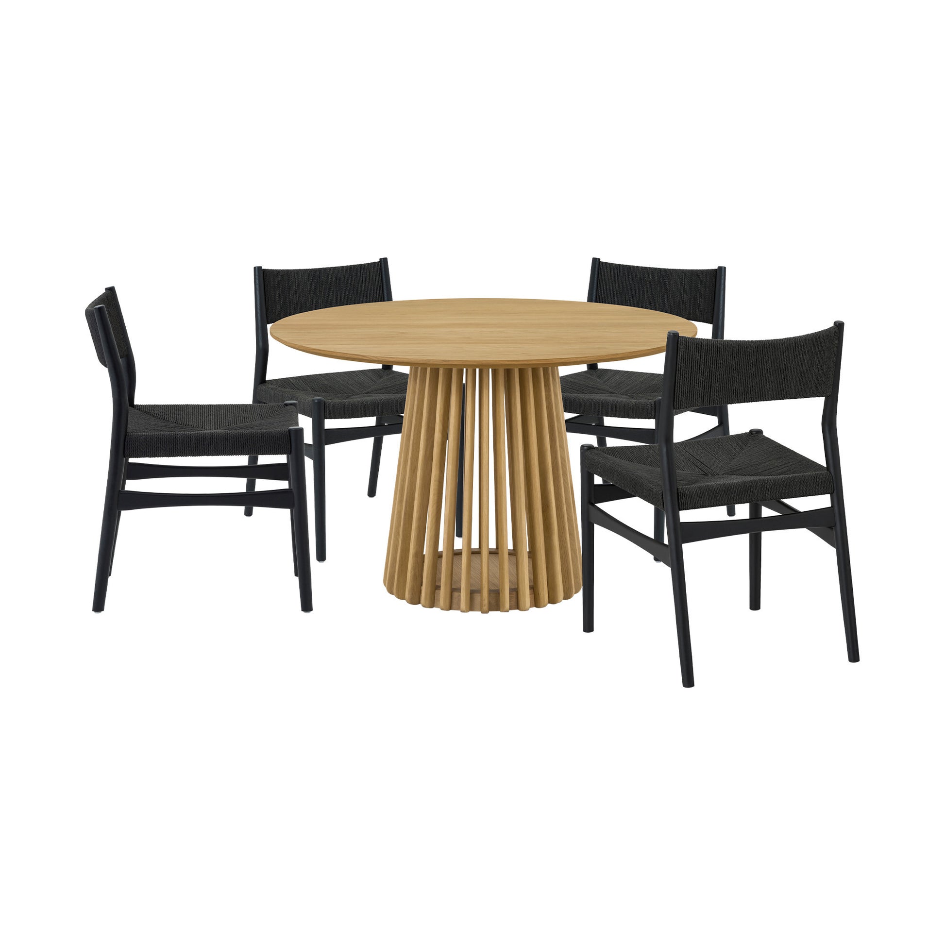 This five piece oak round dining set with four chairs is the right blend of style and comfort. It is designed to be updated and stylish yet comfortable. A manufactured wood flat surface sits atop this solid wood base, giving this round a visually interesting look. Unexpected company. Have no fear, this table expands so that there’s always room for more. The table not only looks great, but it also comes with a set of 4 solid back chairs. You will love the chairs' design and coloration that complement most any home decor. Make breakfast, lunch, and dinner more inviting with this comfortable and attractive dining set. 30-inch H x 47-inch W x 47-inch D