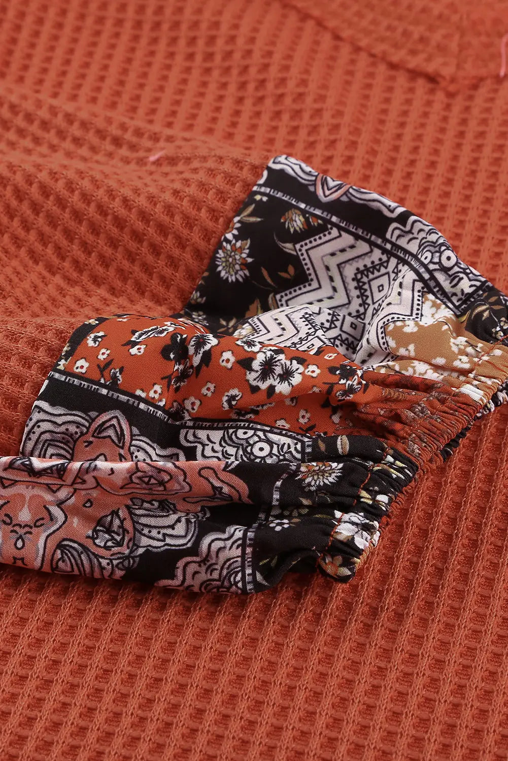Meet Karina Eyelet thermal Knit Top—effortless, flattering, and easy to style for everyday life. Loose fit silhouette Floral print patchwork lantern sleeves Waffle texture fabric with v neckline Perfect to match with any fashion pants womens long sleeve tops are casual, fashionable for female