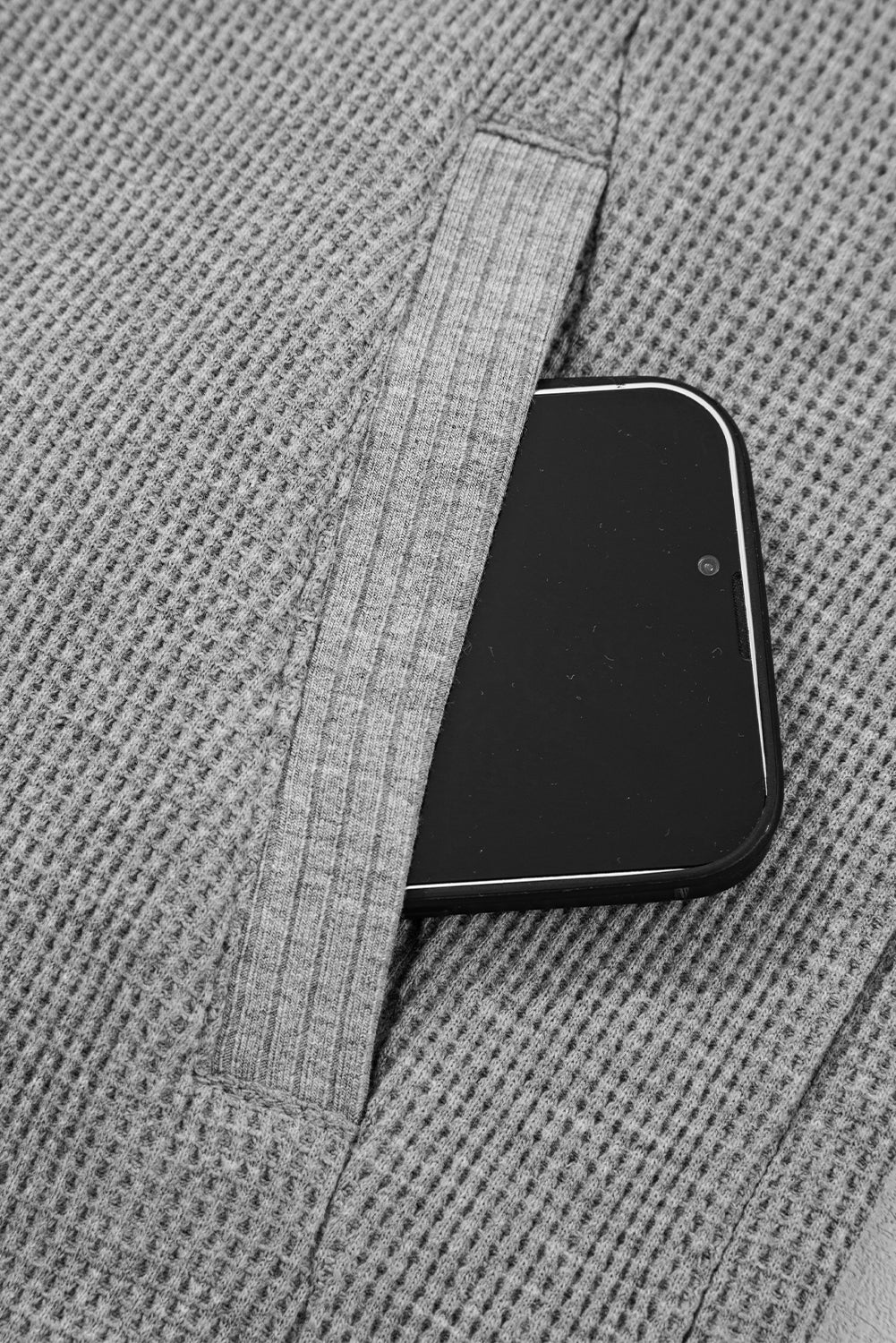 This waffle-textured jacket brings a stylish edge with its premium feel. Featuring a relaxed fit and a cropped length, it’s finished with a zip front, button details, and a cozy hood. This gray jacket is both trendy and fun, perfect for pairing with jeans or casual pants to keep your fall wardrobe fresh and playful.