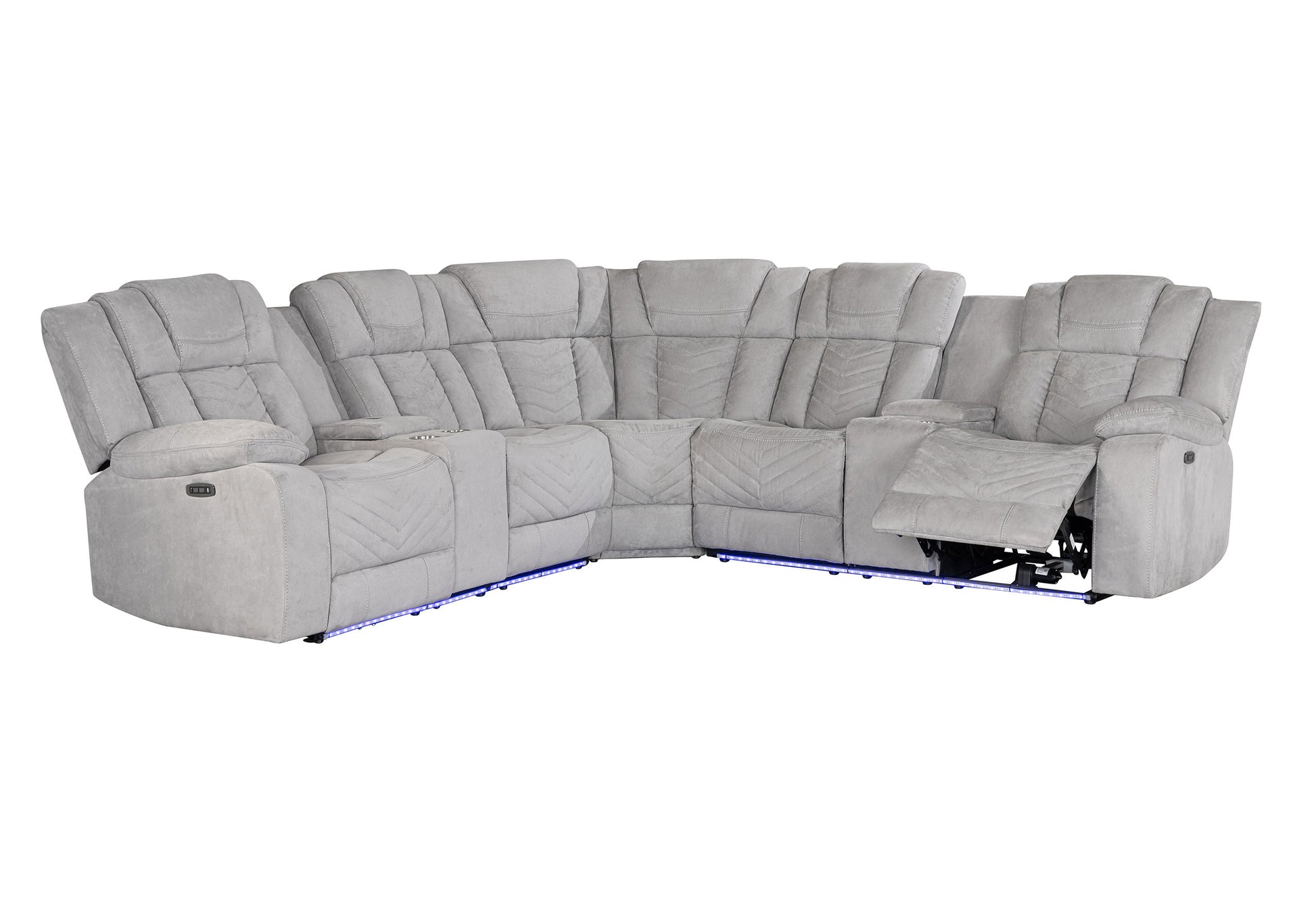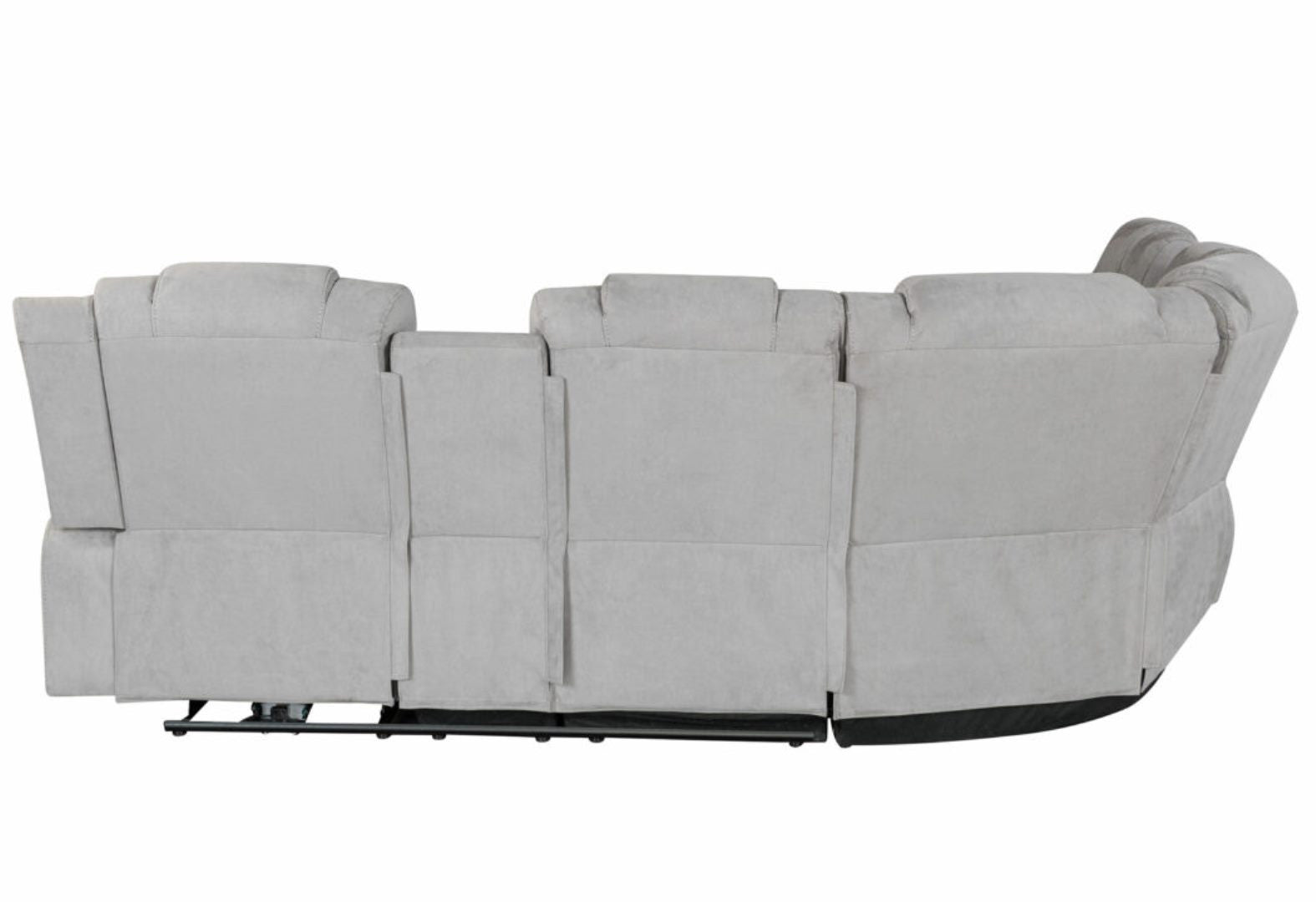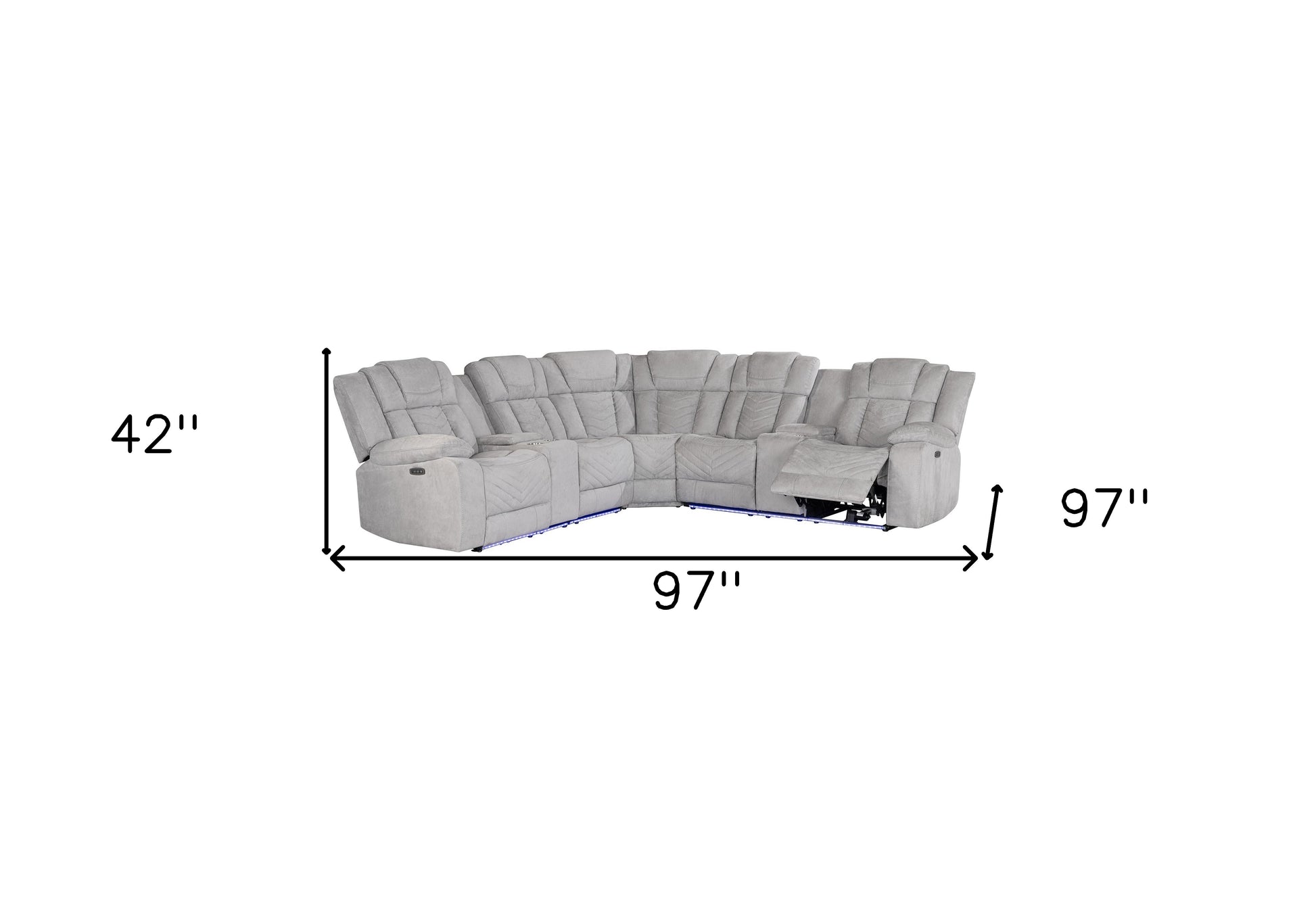Transform your home's interior with this luxurious light gray fabric power reclining curved corner sectional with console. Elevate your lounging to the next level. The solid color corner sectional is upholstered with polyester blend that is easy to care for making it a great option for families and spaces that get lots of use. Pillow top arms offer a comfy place to rest. Two power push button recliner allow you to truly rest, lounge and even sleep comfortably, while the cup holder and USB port give you modern conveniences. Ideal for placing in the middle of a room, this curved showstopper is an unconventional way to seat multiple people in a stylish and elegant manor. 42.00-inch h x 97.00-inch w x 97.00-inch d.