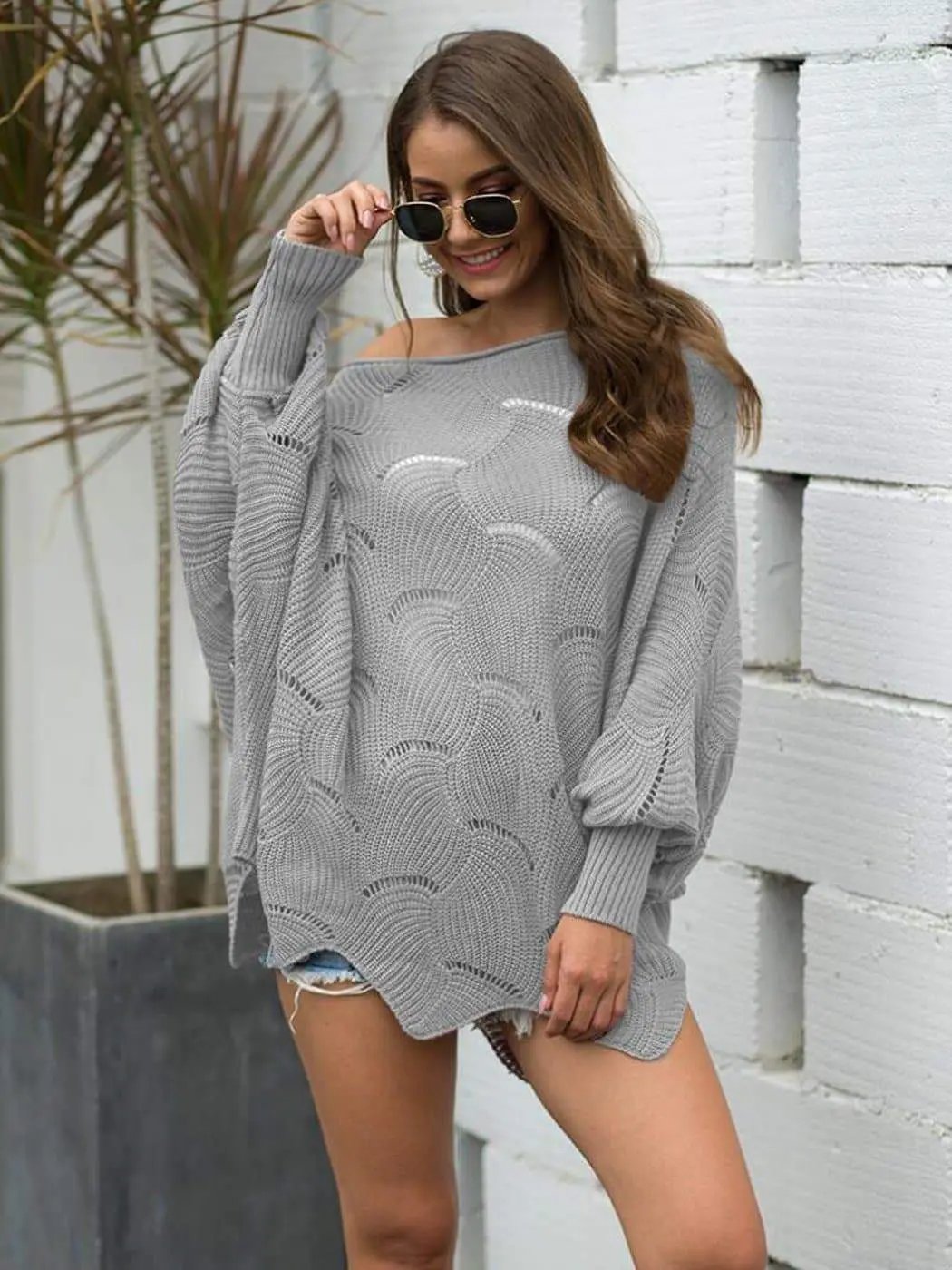 - FEATURES - Eyelet hollow out, batwing sleeve, long sleeve, oversized, boat neck, casual loose, off shoulder, irregular scallop hem, solid color, pullover sweater with tightened cuff.