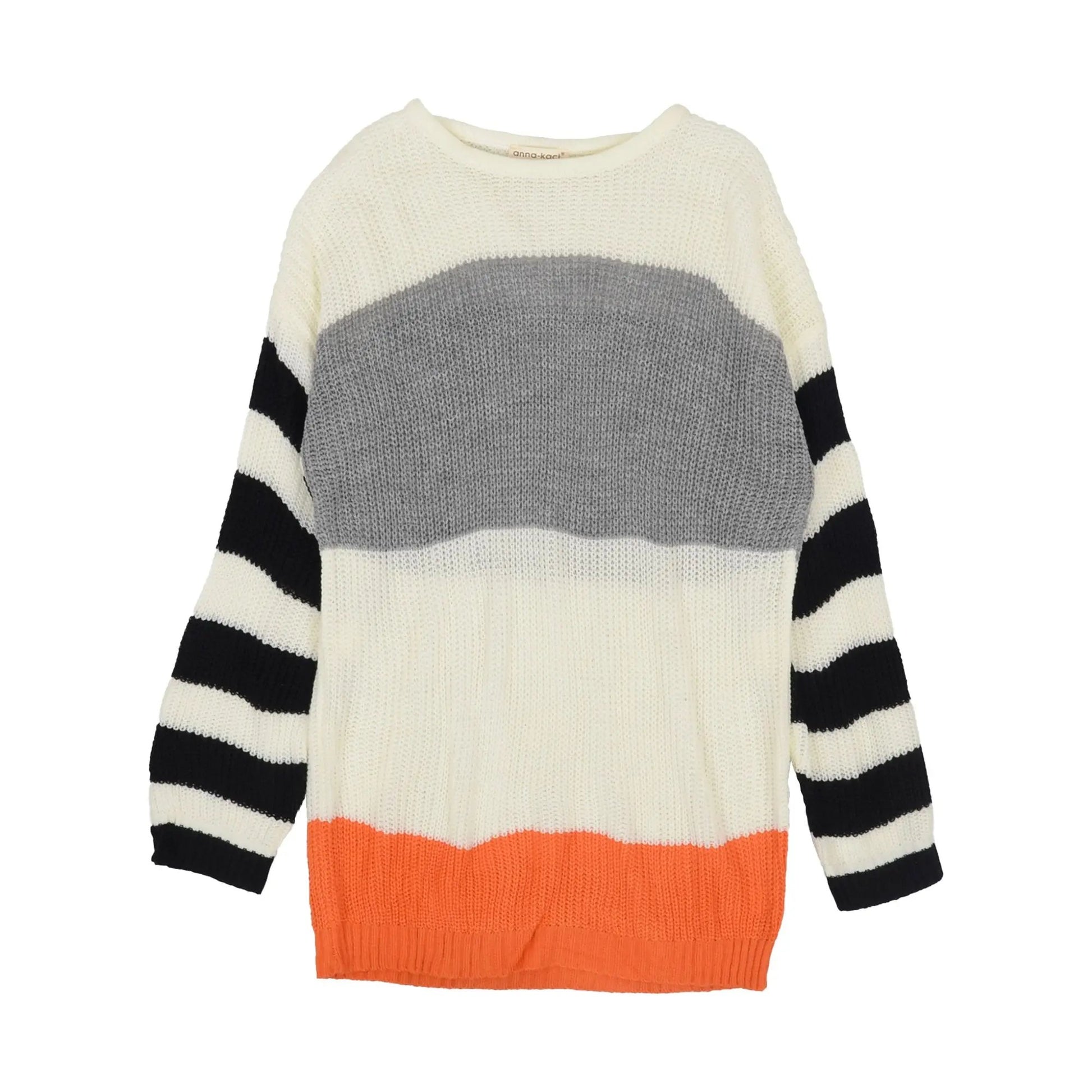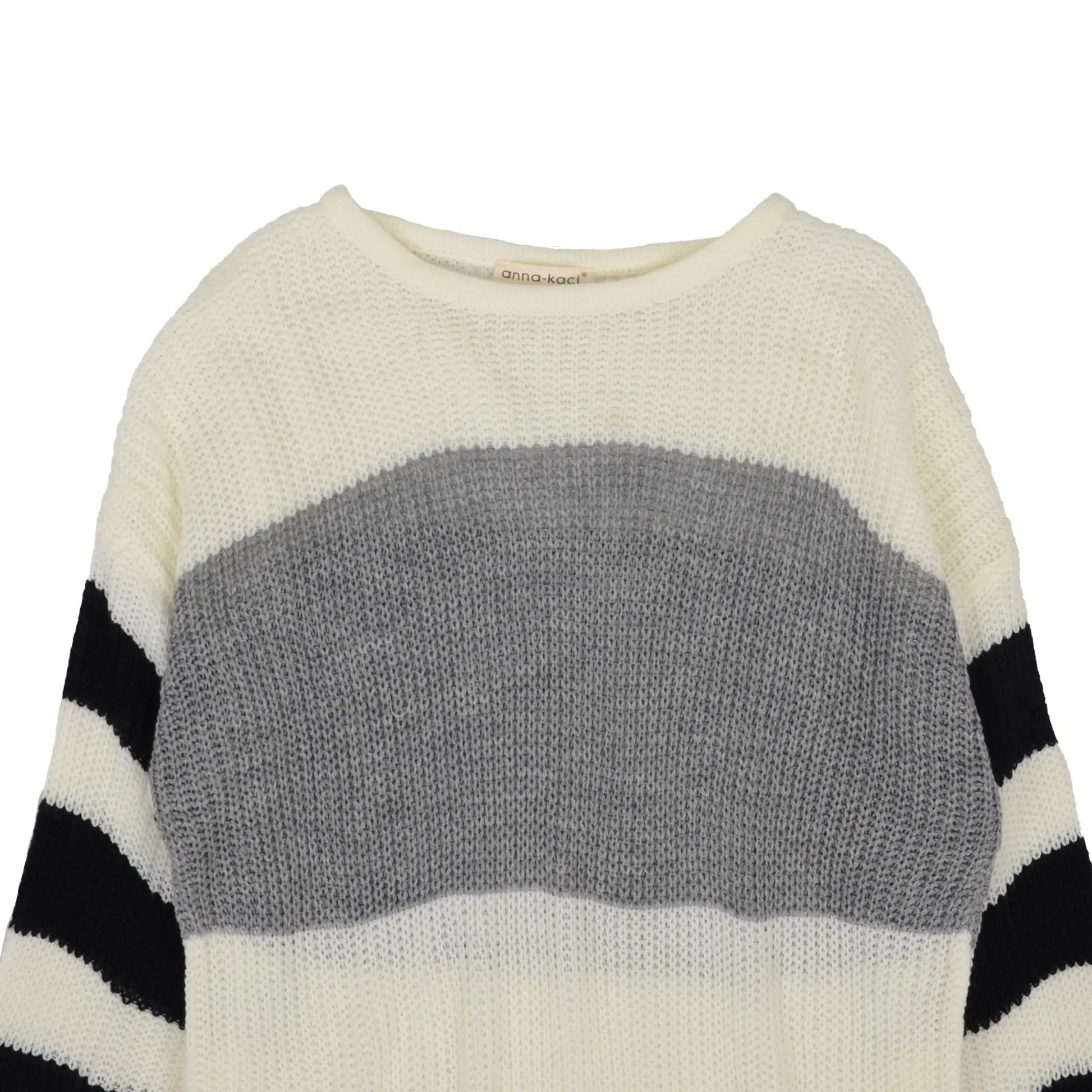 The Anna-Kaci sweater is detailed with fun mixed striped patterns that play with color blocking elements. Features a round neck line, drop shoulder, long sleeves, and an oversized fit. Pair it with jeans and sneakers for a casually cool look.