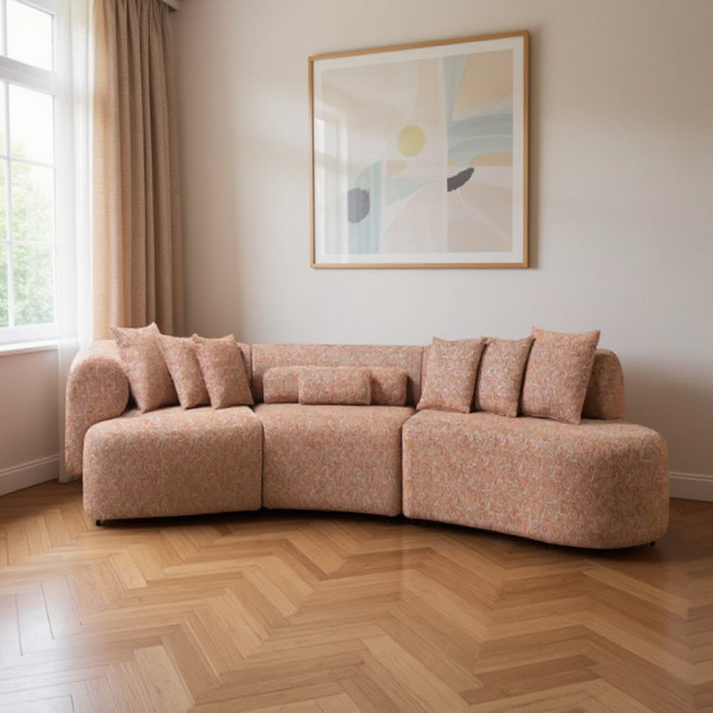 The orange boucle modular curved three piece sectional with toss pillows is spacious design meticulously crafted with extraordinary cushion comfort and ultimate durability so everyone in your home can have the best seat in the house. This contemporary design features a unique curved shape with an arm on the left and room for lounging on the right. Upholstered with supremely cozy and soft textured boucle with nine toss pillows included, this curved showstopper is an unconventional way to seat multiple people in a stylish and elegant manor. 30.00-inch h x 145.00-inch w x 42.00-inch d.