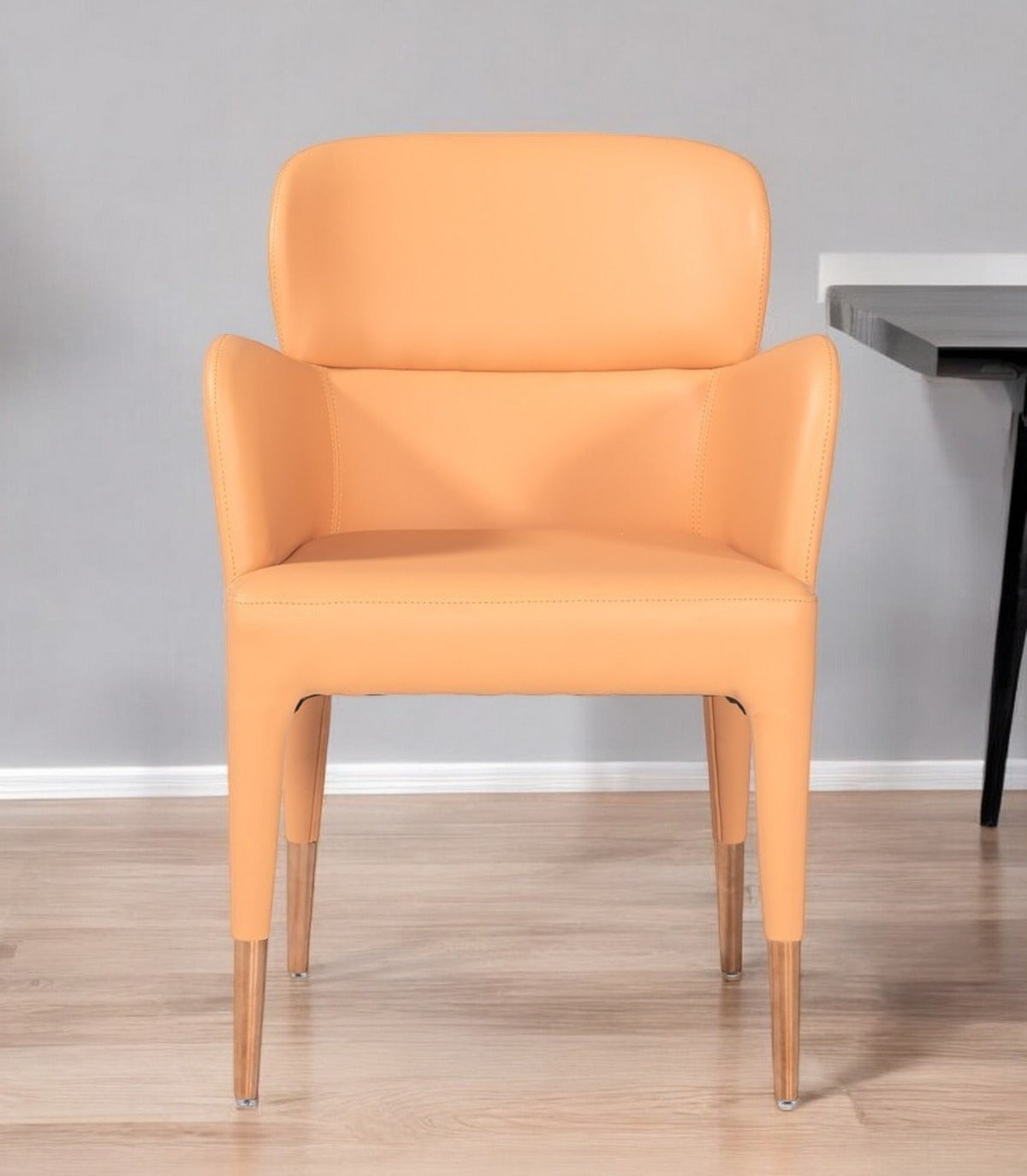 Bring this comfortable peach upholstered fabric dining armchair to your table to enjoy long lasting quality time with your family and friends. Complete with solid back, this chair not only looks good but is comfortable. Dining chairs are a great way to compliment your kitchen or dining room but can also be used in the foyer, hallway, or any room you might need extra seating. 32-inch h x 20-inch w x 25-inch d.