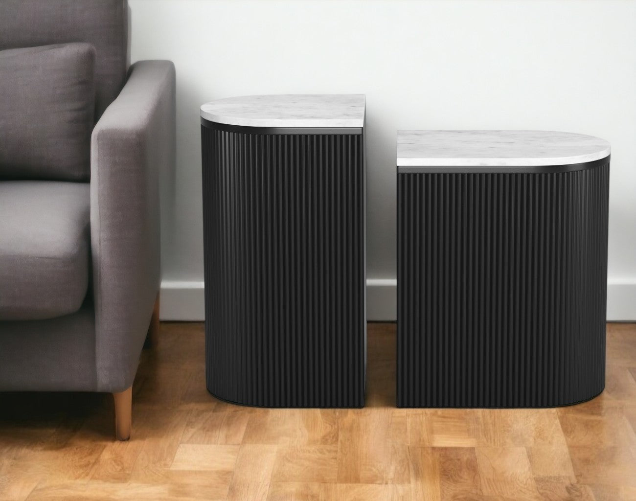 Increase your decorating options with this set of two white and black marble and solid wood oval block end tables that will enhance your space. This pair makes the ideal companion for sofa or bed and can be used apart but designed to create a unique table setting when pushed together. The black solid wood frames features textural line detailing and are finished off with a white marble top that is the epitome of quality construction and design. This sleek and modern table makes a practical and unique accent. 20.9-inch h x 18-inch w x 14-inch d.