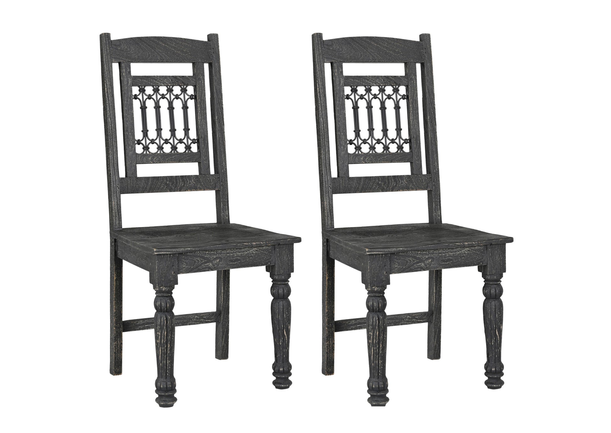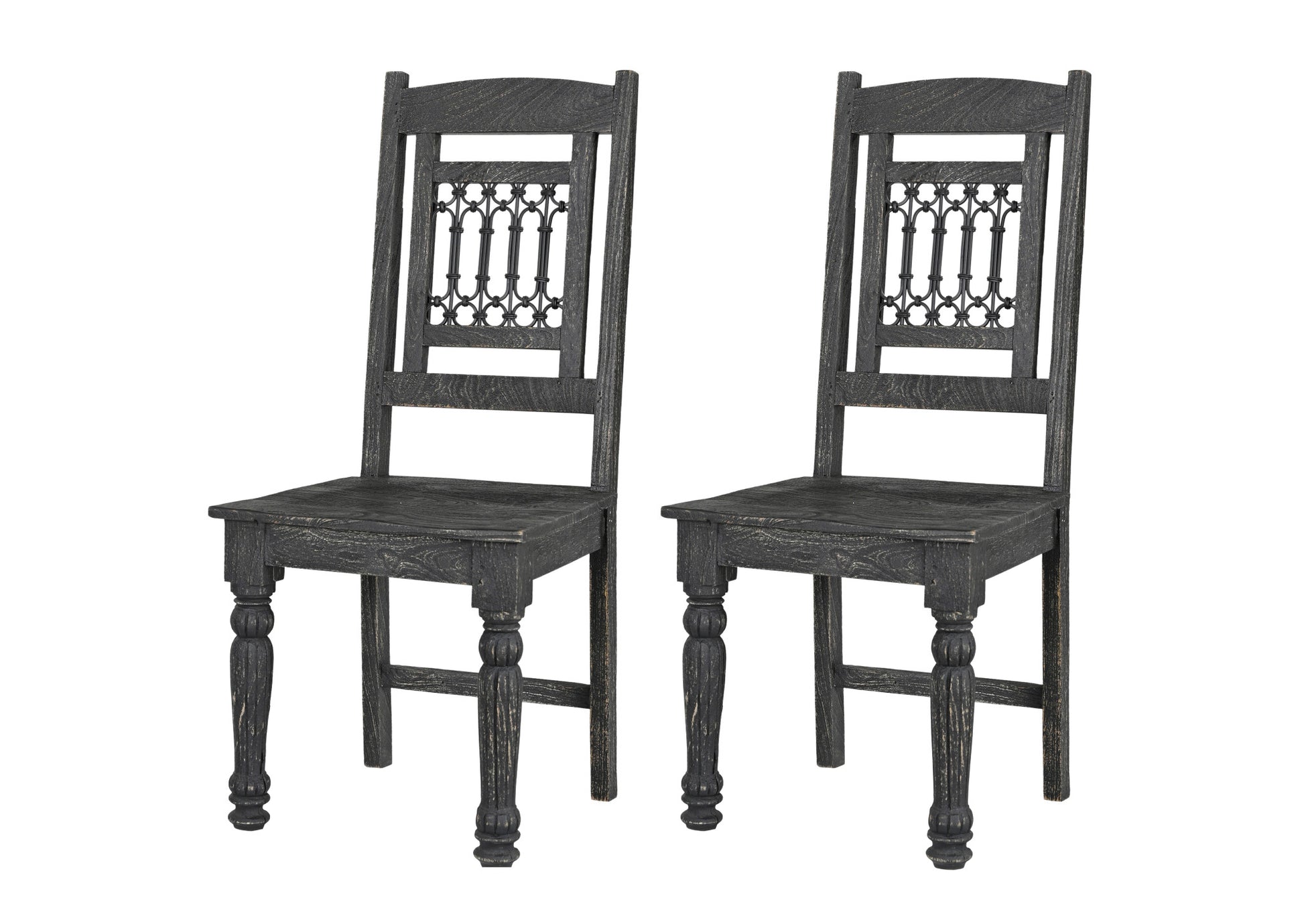 Bring this comfortable set of two black wood carved and slat back dining side chairs to your table to enjoy long lasting quality time with your family and friends. This armless chair has a slim silhouette making it ideal for seating around the table but can also double as an accent chair. The designer cut out back gives this chair its unique style. A washed and distressed finish is used to create a slightly rustic and vintage touch. Dining chairs are a great way to compliment your kitchen or dining room but can also be used in the foyer, hallway, or any room you might need extra seating. 42-inch h x 18-inch w x 18-inch d.
