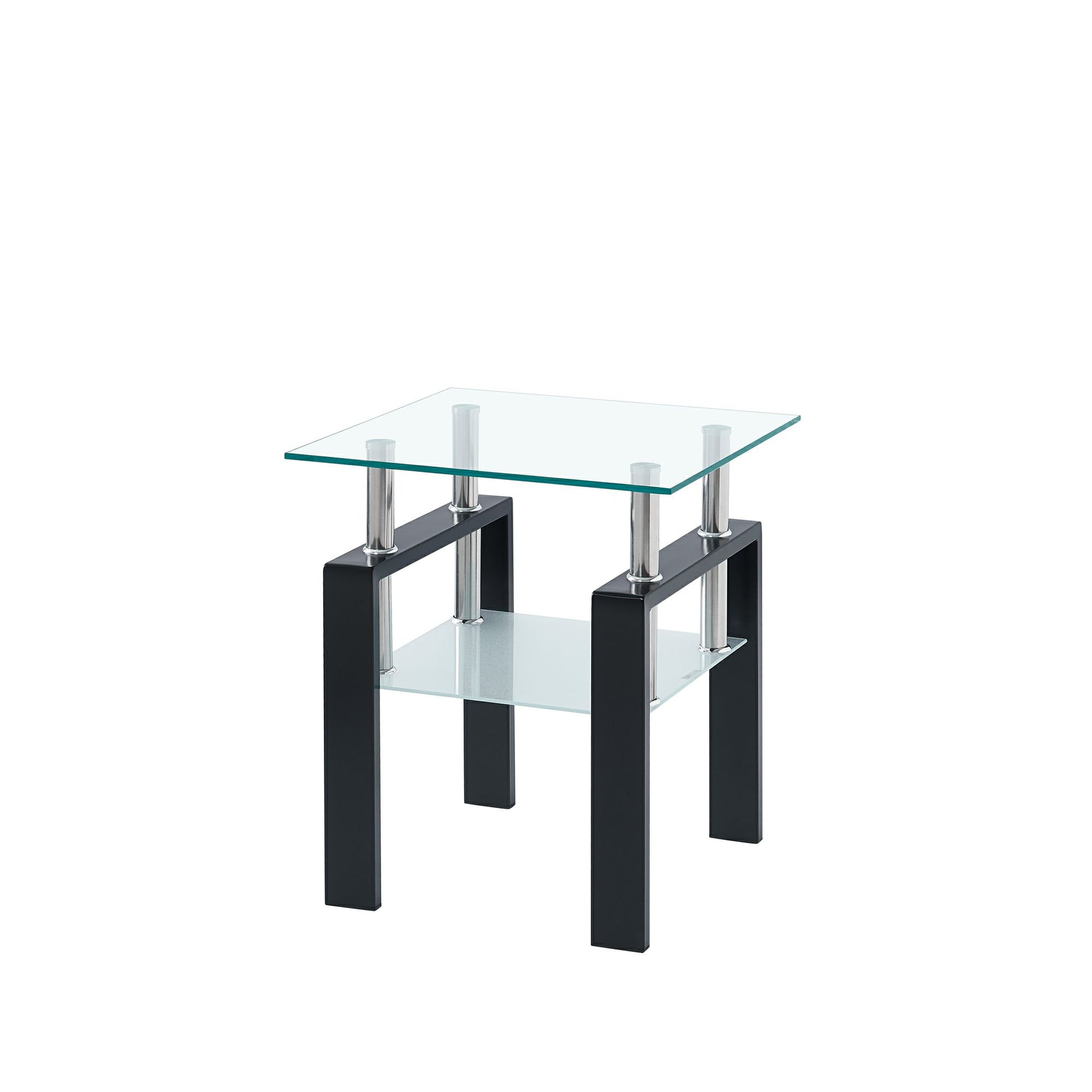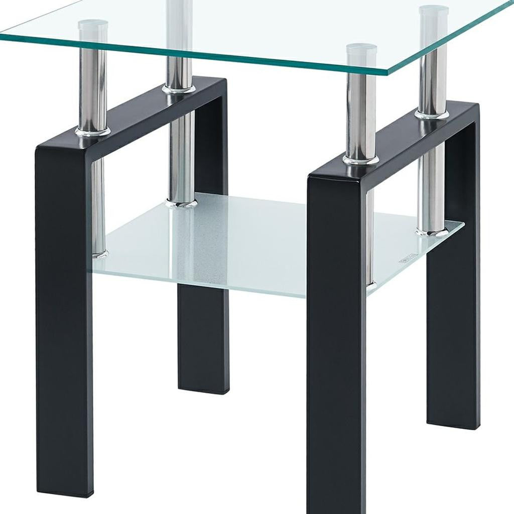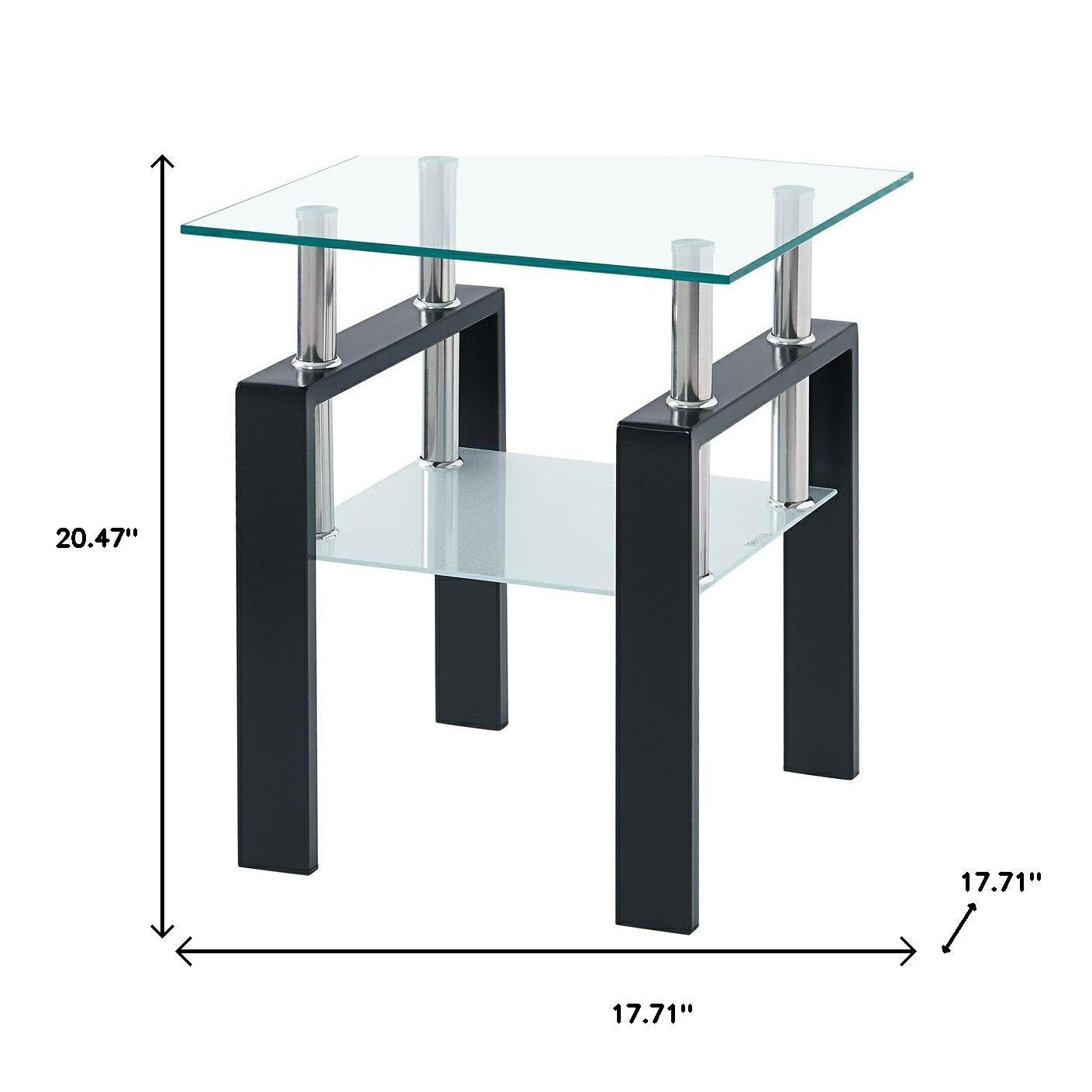 Increase your decorating options with this set of two clear and black glass and metal square end tables with shelf that will enhance your space. This pair makes the ideal companion for flanking the sofa or bed and can be used together or separately as you choose. A black metal frame is finished off with a clear glass top that is the epitome of quality construction and design. Help to keep your space organized with the included single shelf. A great accent on either side of the sofa or bed, this adorable end or side table is just what you need. You can also use it as an entryway table to hold your keys. 20.47-inch h x 17.71-inch w x 17.71-inch d.