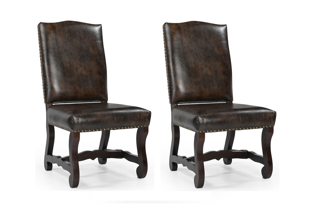 Out with the old and in with the new, this set of two dark brown upholstered leather dining side chairs can perfectly suit any dining table. This armless chair has a sleek silhouette making it ideal for seating around the table but can also double as an accent chair. Upholstered with soft and supple genuine leather, this chair includes high end detailing such as curved legs and nail head trim to wow you and your guests. Dining chairs are a great way to compliment your kitchen or dining room but can also be used in the foyer, hallway, or any room you might need extra seating. 41.5-inch h x 22-inch w x 24-inch d.