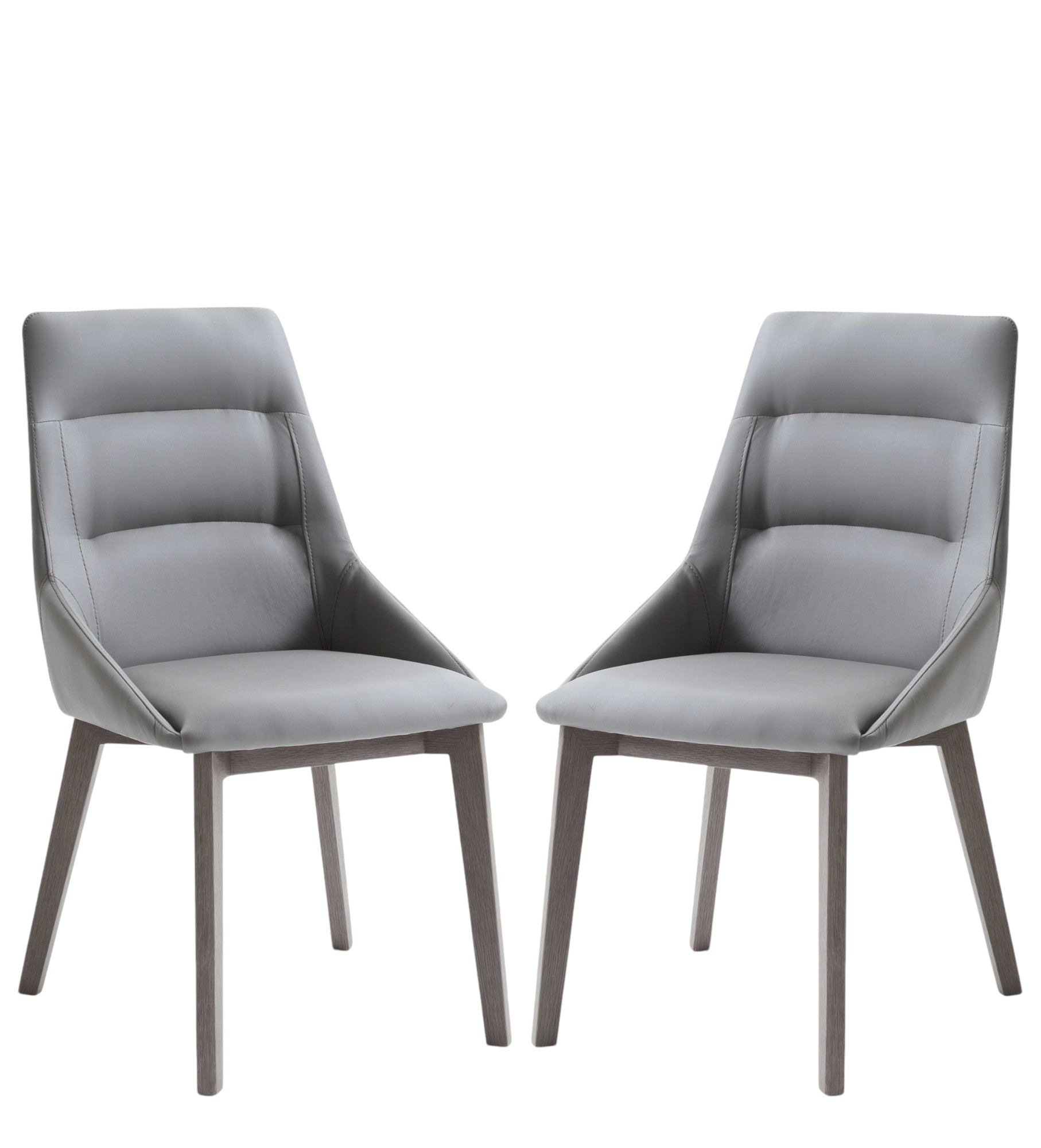 This set of two gray upholstered faux leather dining side chairs is not only good looking, but it also provides long lasting support. The side chair has no arms so it can easily fit around the table. Can also be used as an accent in living room or bedroom. Dining chairs are a great way to compliment your kitchen or dining room but can also be used in the foyer, hallway, or any room you might need extra seating. 35-inch h x 25-inch w x 20-inch d.