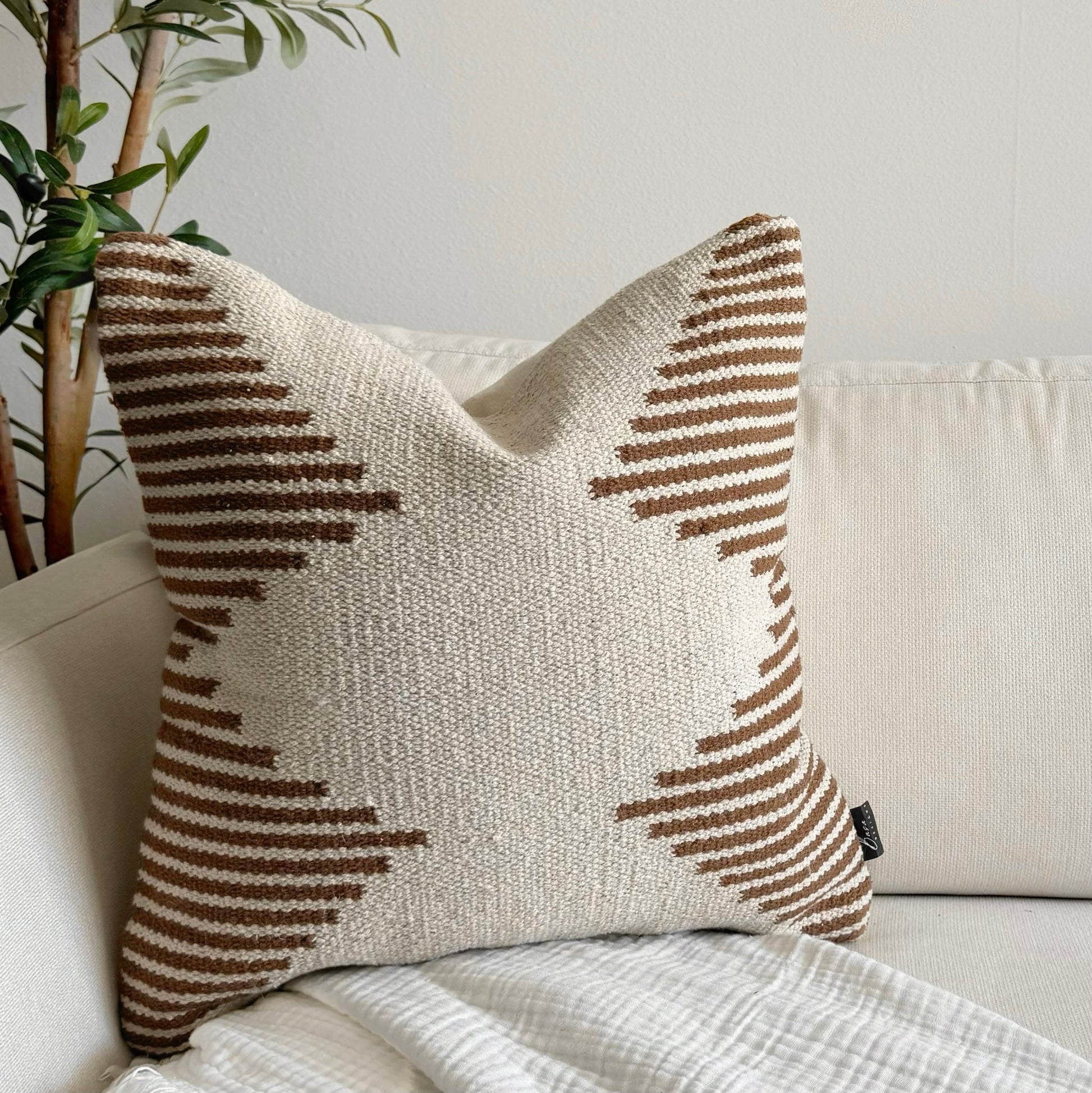 Elevate your home with the timeless texture of this handmade 20x20 Kilim pillow cover, featuring a bold geometric tribal-inspired pattern in warm brown on a neutral base. The woven Kilim fabric adds depth and character, making it a versatile accent for any sofa, bed, or chair.
