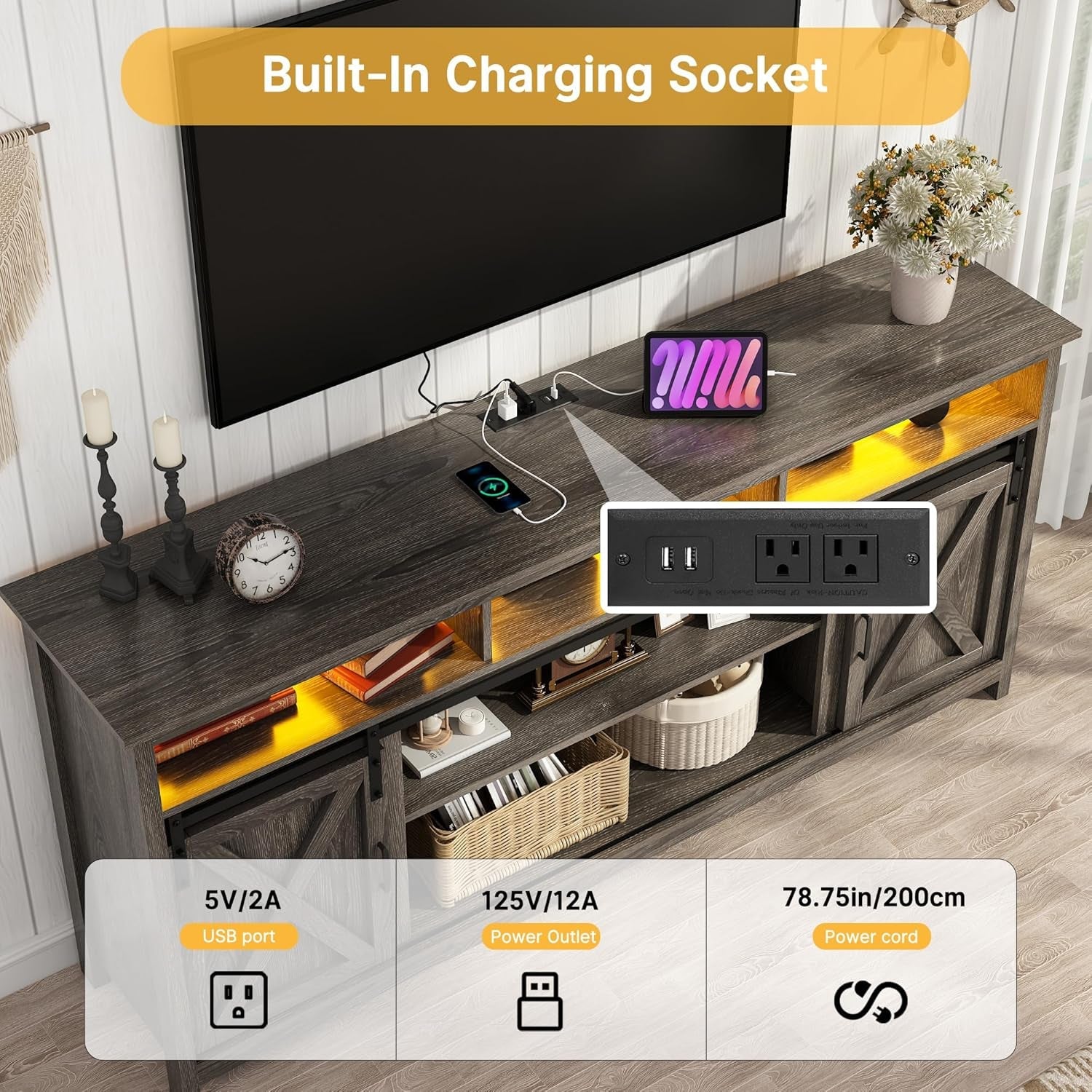 - Double-layer storage with a charging socket keeps consoles, streaming devices, and chargers organized and within reach.